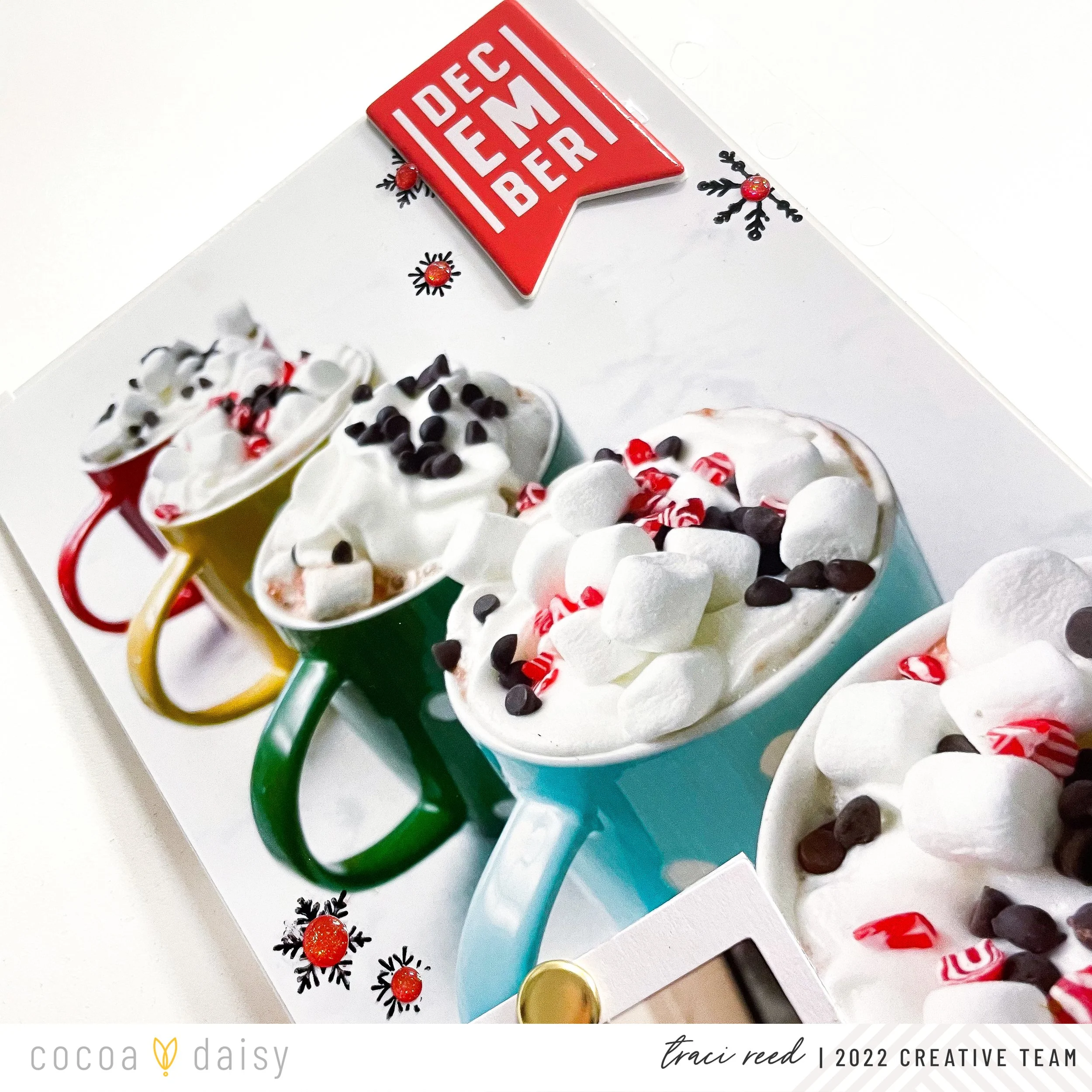 On the pocket side, the 4x6 incorporates one of the 3x4 cards I made in my Stress-Free December Daily Prep Day 4 Video with a photo of said hot cocoa bar and title. I added stamping here via an older cocoa daisy number stamp set and more snowflakes + enamel dots to make it coordinate with the large photo.