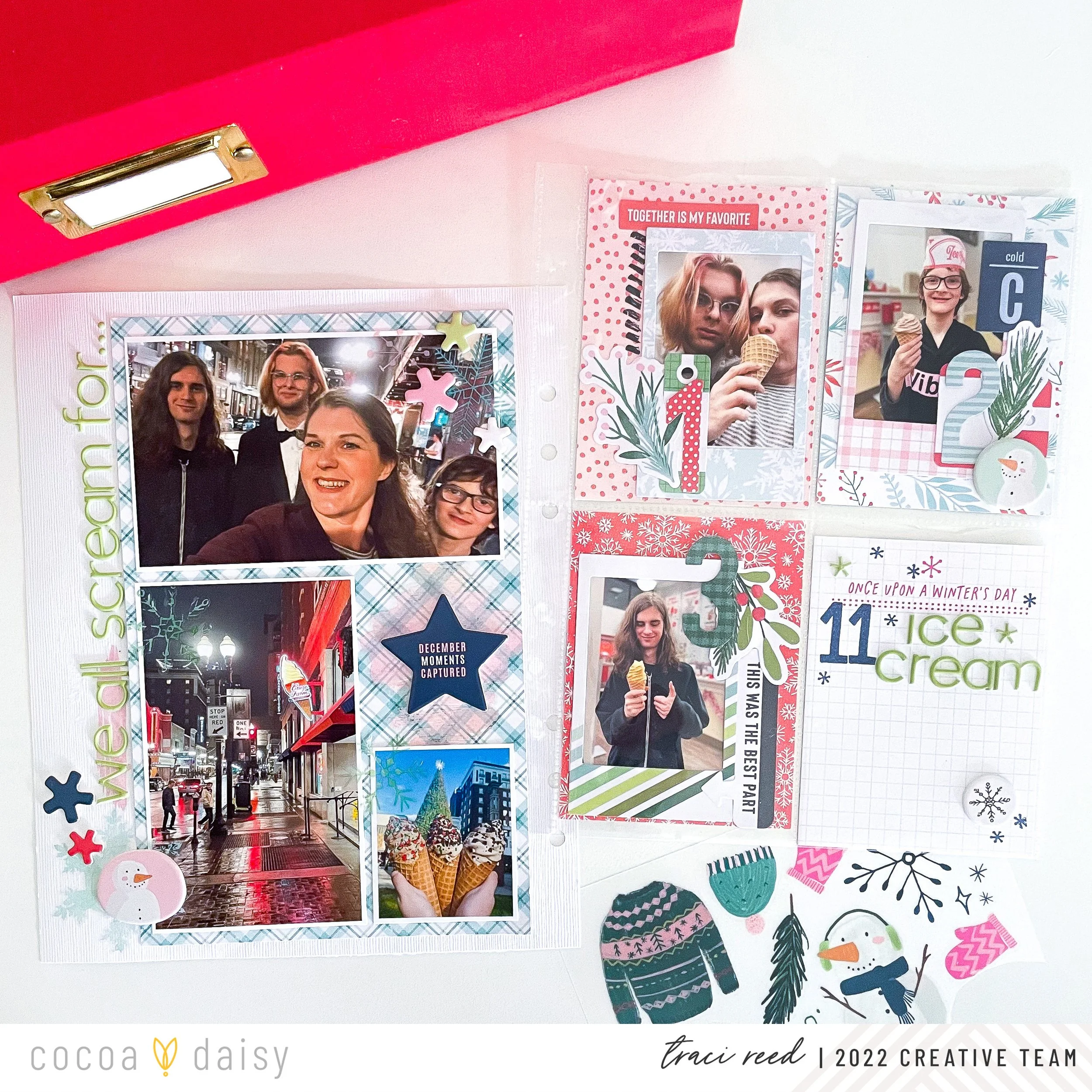 I used one of the pocket foundation pages I created during my Stress-Free December Daily Prep Day 4 Video using the CD Frost and Frolic Traveler’s Notebook Memory Keeping Kit (sold out) as a kick start for this page and decided to pair it with another grid of a different kind on the left hand side!