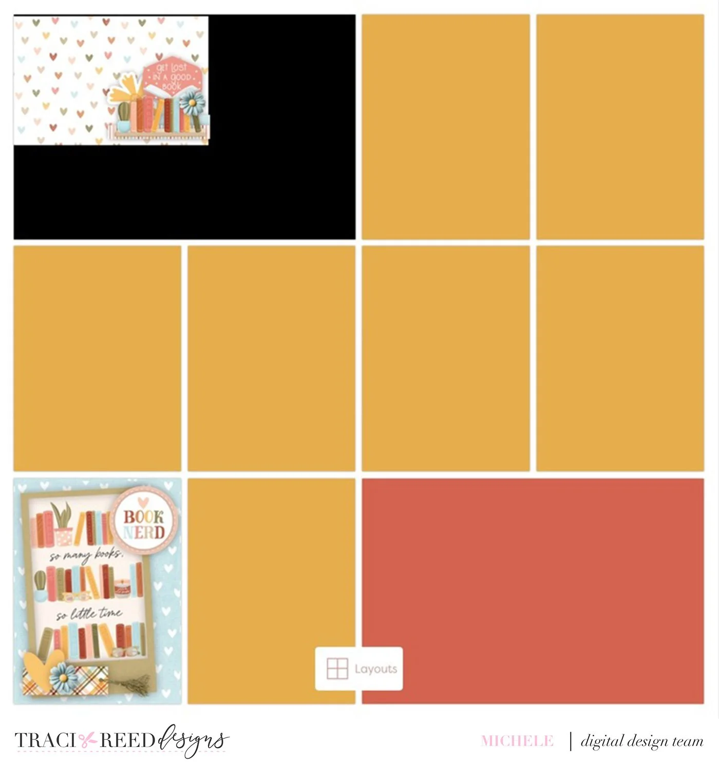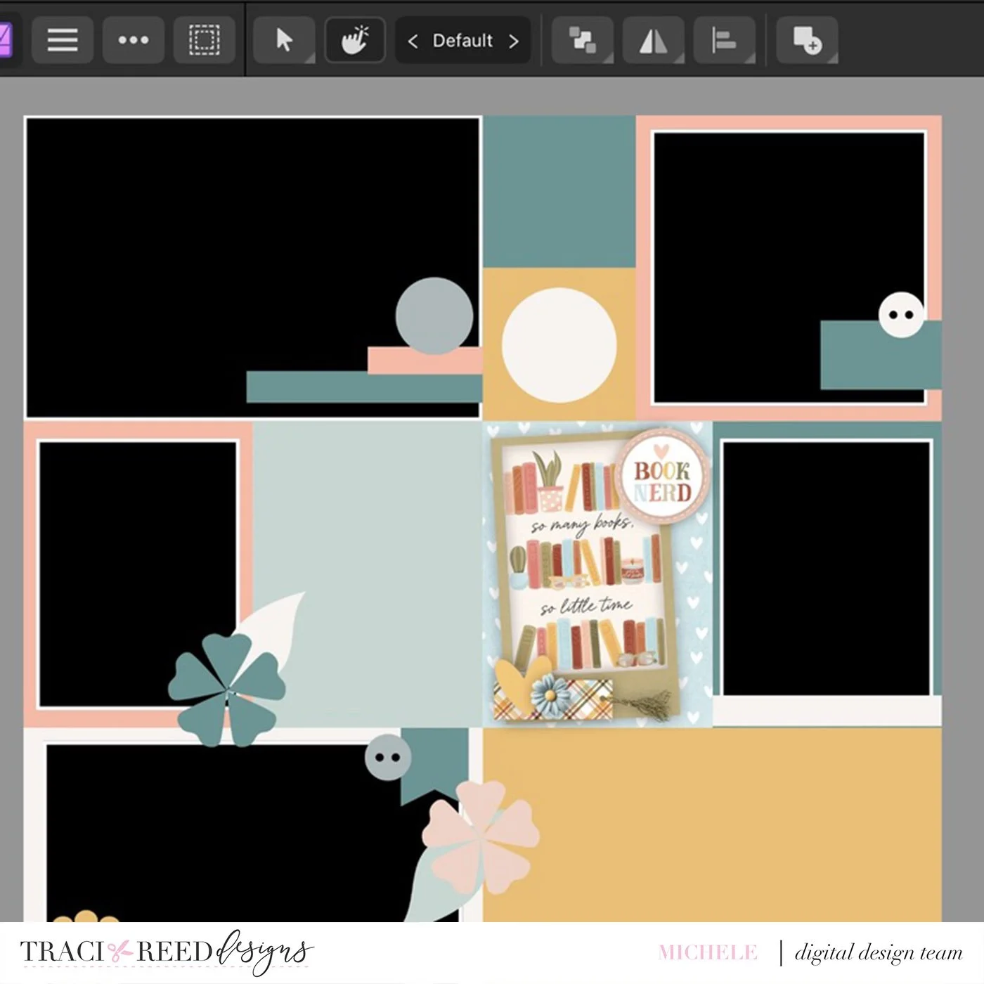 I love the simplicity of the Project Life app and the versatility of the filler cards that come in the Bookish collection but sometimes I like to play with more a more complicated design. I have found that finding parts of templates that I can turn into 4X6 cards or 3X4 allows me to play a bit, but keep the layouts organized in the Project Life app-which I consider my main organizational place for appscrapping.
