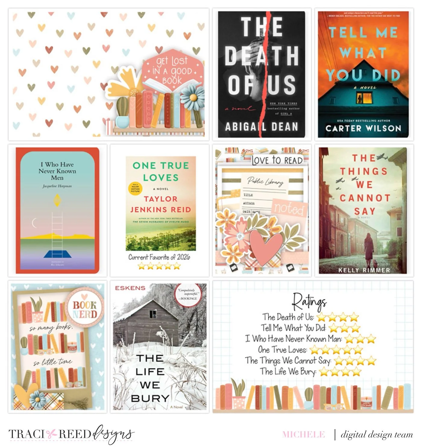 The filler cards I made in Affinity with a pocket template (2 cards with Pocket Starters 12 and one card with Pocket Starters 9). The card I put the ratings on, I just pulled directly from my Bookish file and did not embellish.