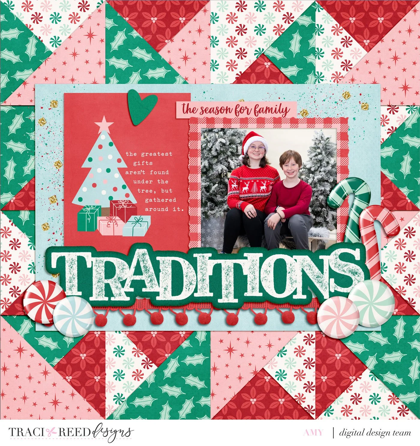 The Festive kit papers make this layout POP! A quilted background gives the page instant coziness and nostalgia, perfect for any Holiday Tradition page!