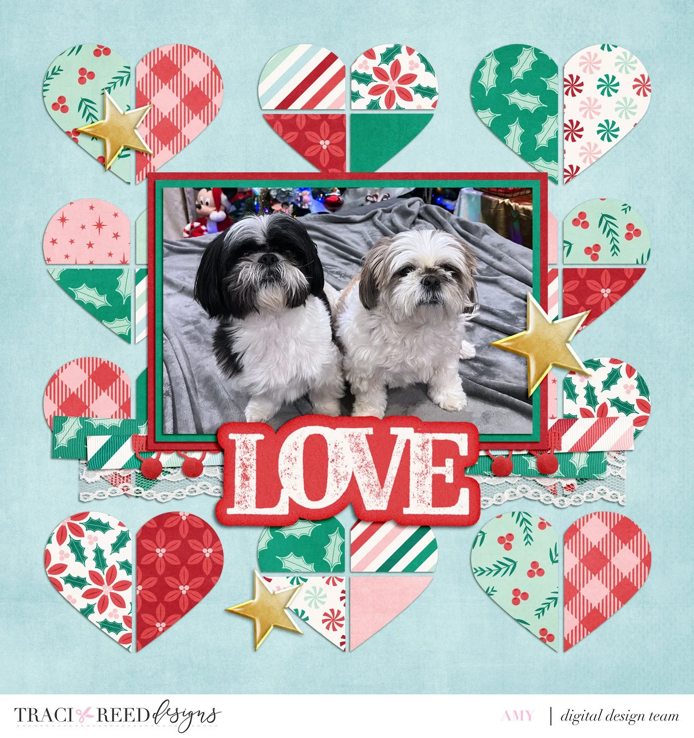 My second layout uses a background of heart shapes split into different sectioned pieces. Repeating shapes with varied patterned papers adds rhythm to the layout while keeping everything cohesive. Mixing a bold red on one side and a lighter mint or holly print on the other keeps each heart visually interesting without stealing the spotlight from the photo. This is also a great layout to try if you are trying to use up some paper scraps!!