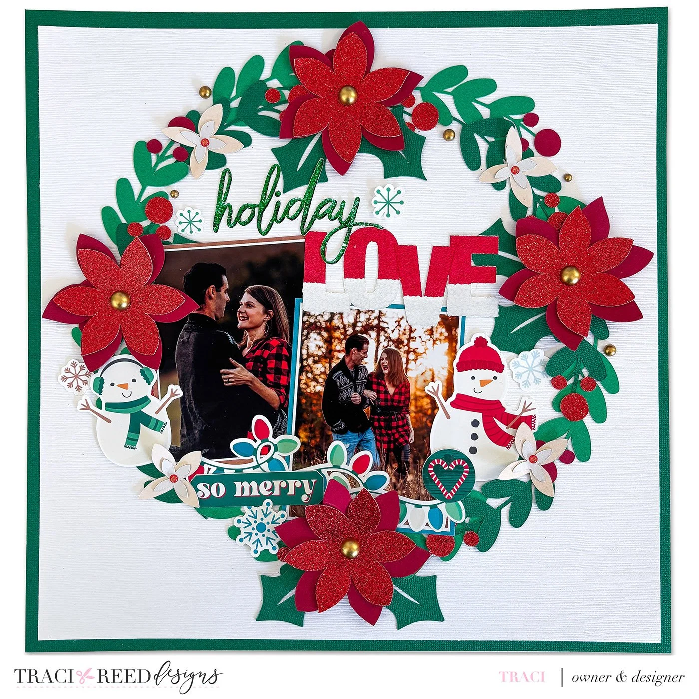 The most recent addition to the Christmas lineup is Oh, What Fun! And I love this classic take on Christmas! My layout uses the wreath cut file and I cut out one layer of my poinsettias on glittering card stock for some extra pop!
