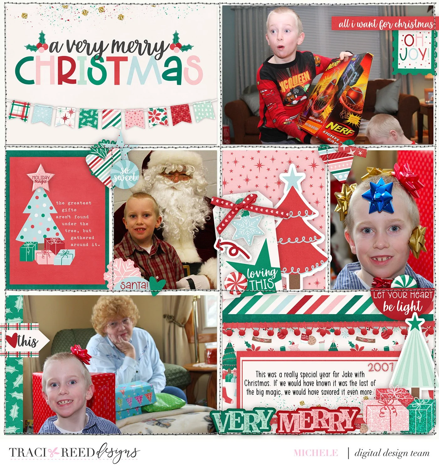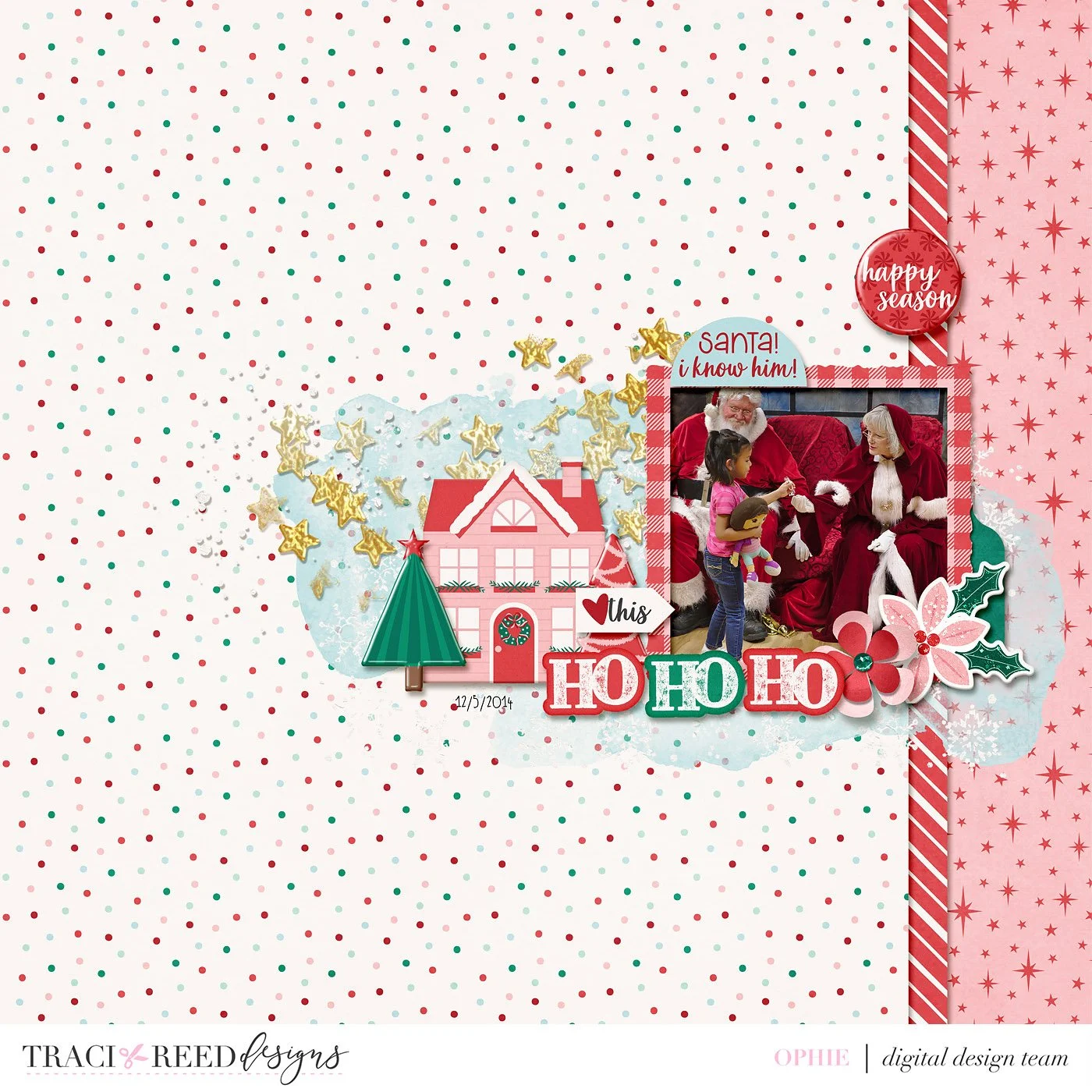 Traci’s Festive collection has such merry colors and perfect for the happy holiday. It paired well with my photo of Santa (and Mrs Claus!) meeting my child. I decided to show off some patterned papers layered to the side and placed the elements around the photo. It came together nicely.