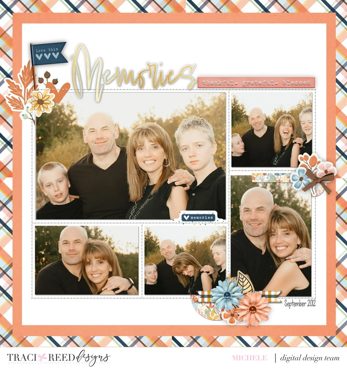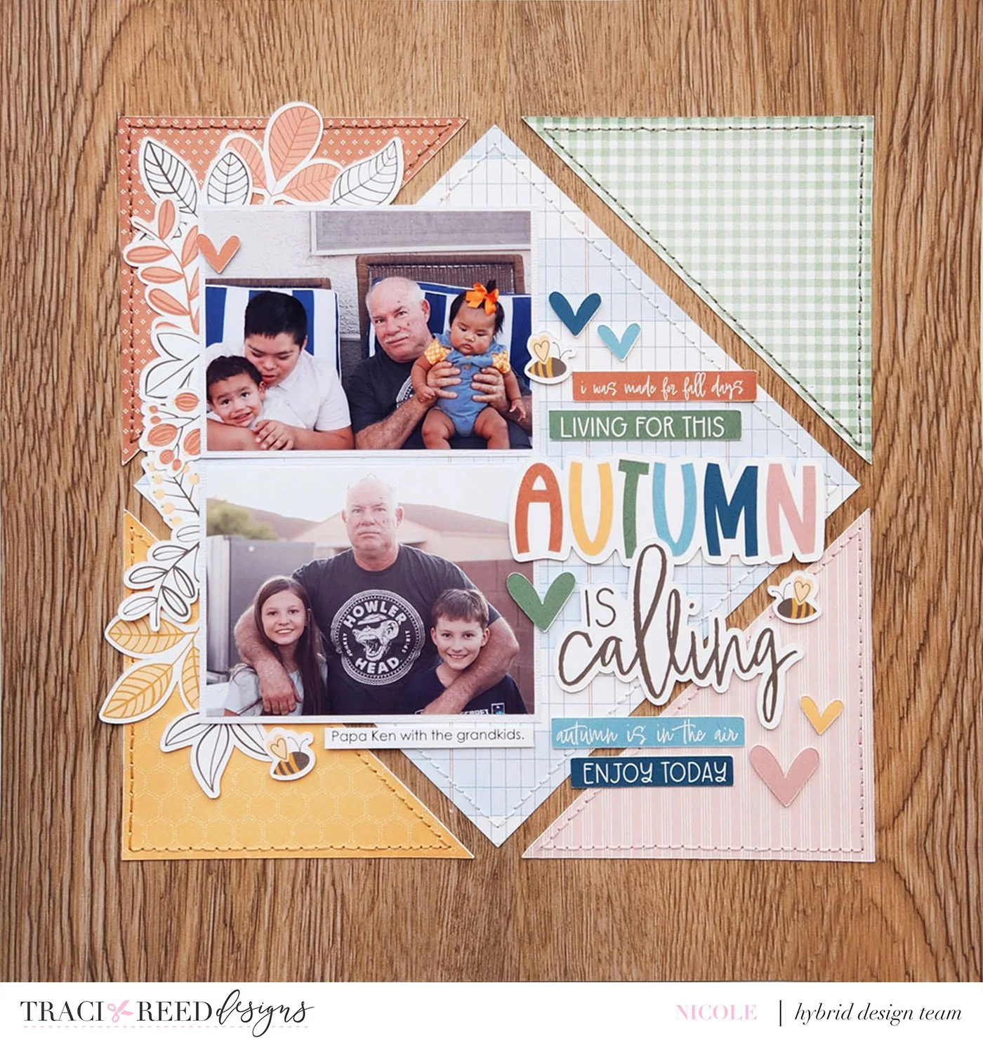I rarely have the opportunity for fully fall themed layouts as I live in a very hot climate. Equinox is filled with so many good basics and a color palette perfect for those family moments that just happened to occur during those cool fall months. I don’t have a wide format printer so I keep a stash of basic woodgrain papers that I know will pair with all of Traci’s paper perfectly. Some hand stitching adds that touch of homeyness and family feels.