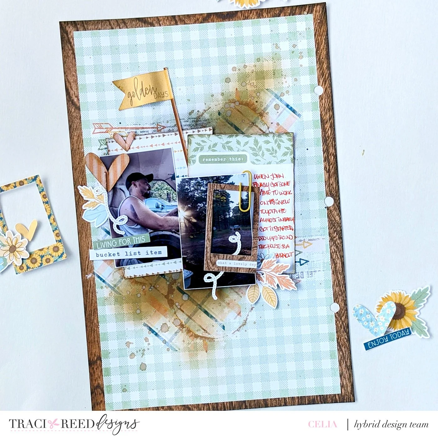 I confess: my favorite flower is a sunflower and so Equinox is one of my favorite collections because it features them so prominently. For my 35th birthday, my husband and I had photos done in a gorgeous sunflower field and of course I am continuously scrapbooking them with this collection! I decided to go all-in on the sunflower theme and create a giant one in the middle of my canvas and it’s a showstopper!