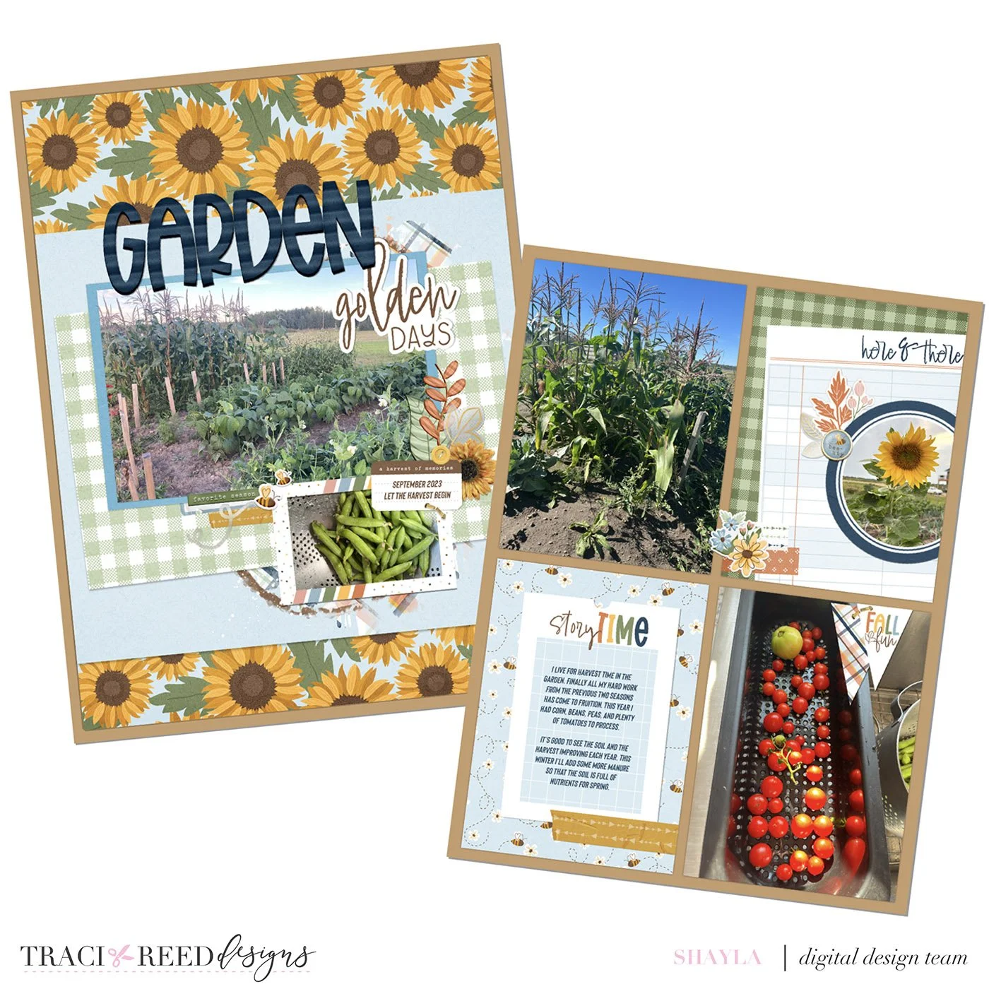 I’m working in my 6x8 album again, which I usually do pocket-style pages for, but this time I wanted to have a mini layout on one side. It can be a challenge for me to work on such a small scale compared to 12x12, so I tried to keep the amount of embellishments pared down and instead let the gorgeous sunflower paper do most of the heavy lifting! I layered a few papers for a spot to rest my photos and sprinkled in bees across both pages. So appropriate for a garden layout. I love the foiled clear embellishments so I tucked some into clusters on both pages. One of the circle journal spots became a photo holder on my pocket page and I cropped one of the vertical Polaroid frames to use it horizontally on my full page layout side.