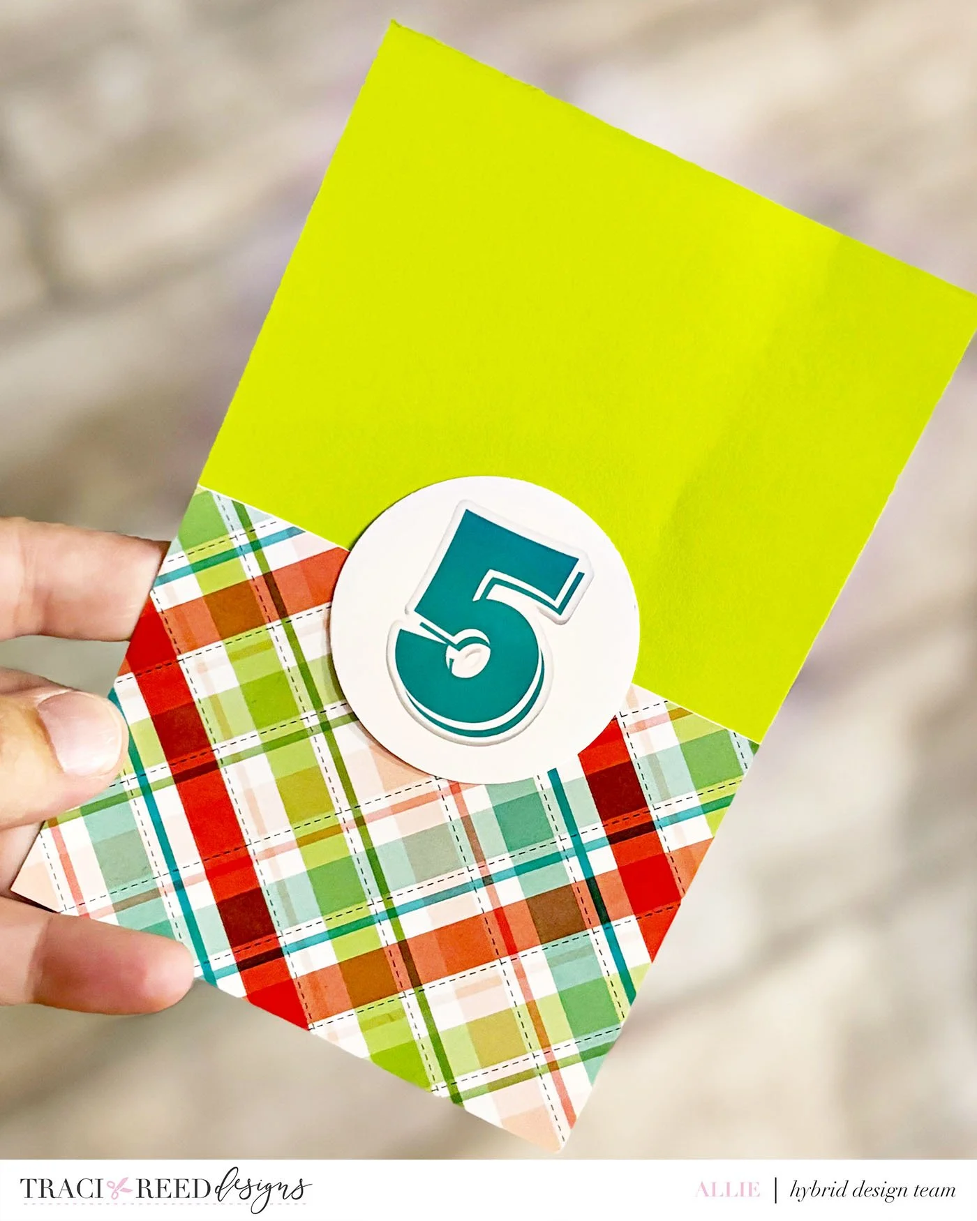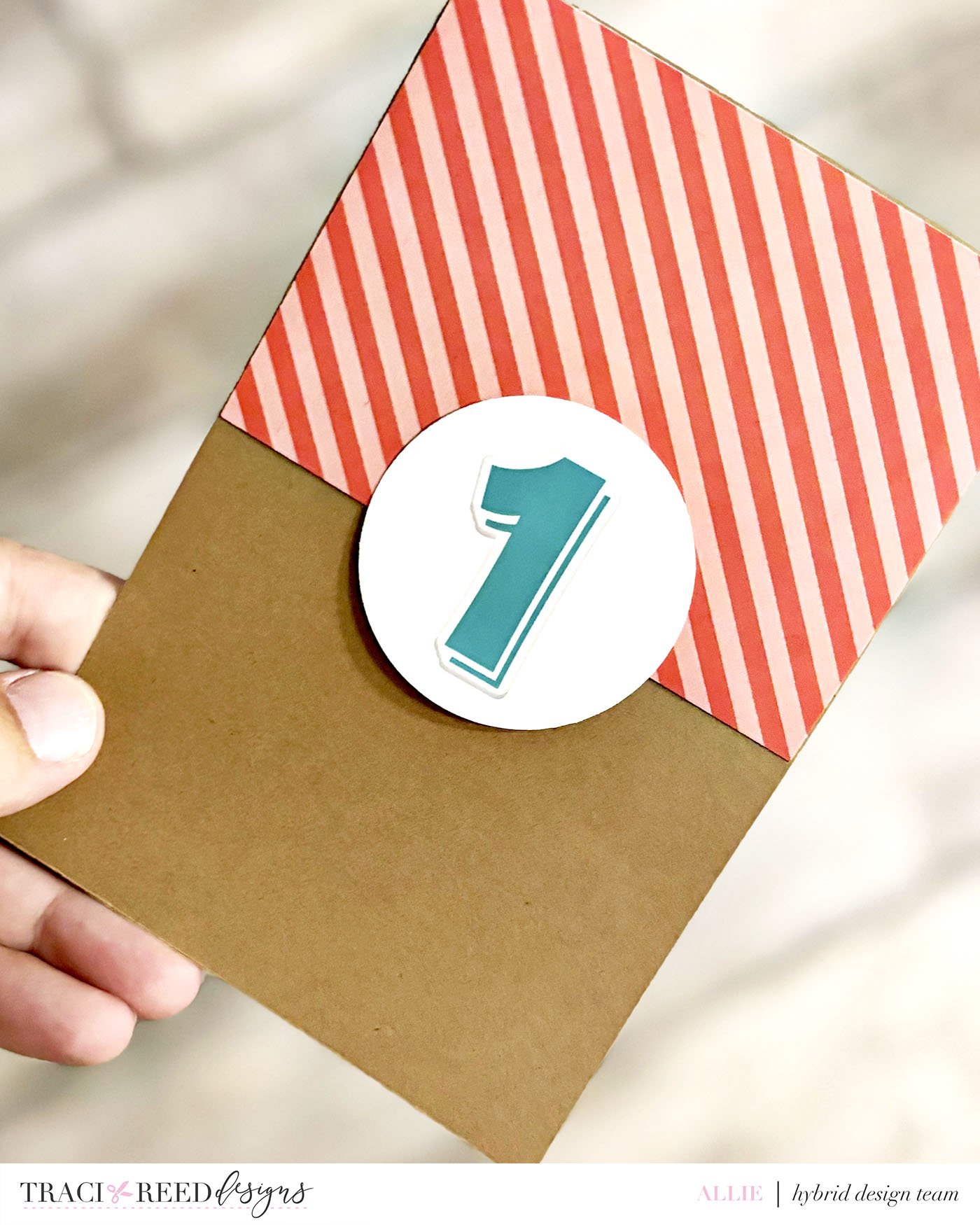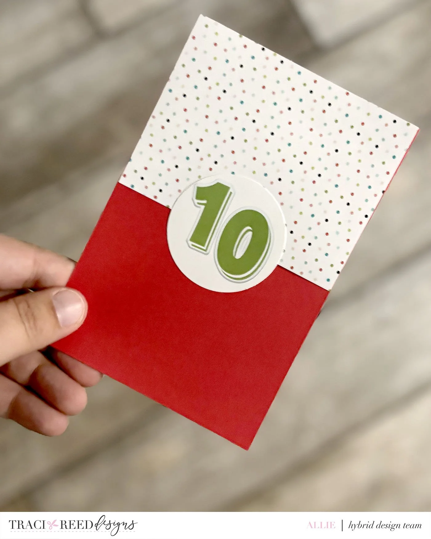 I cut the patterned photos in half, and used glue dots to stick them to the plain cardstock cards-- I tried to give some variety to the different cards! I used a circle punch to punch out the numbers (using the cute alpha set!) I printed on a white background, and then put that in the middle of the card.