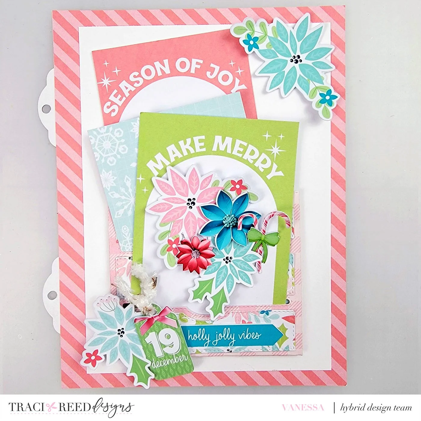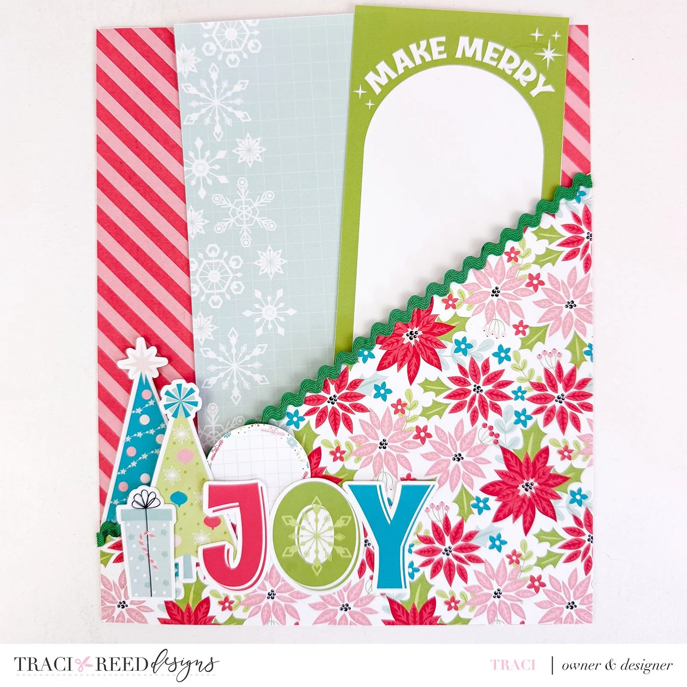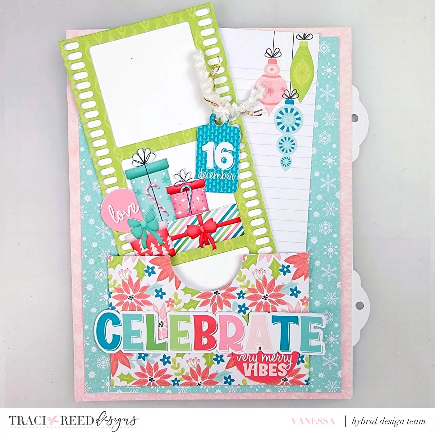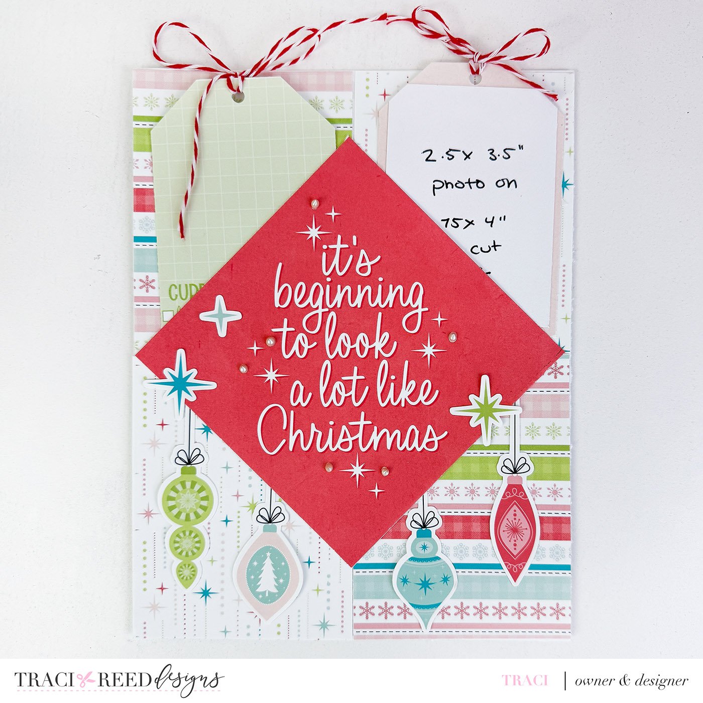 My third page takes advantage of a 6x8 journaler cut into a diamond around the sentiment. I adhered with red line tape just in the center of the diamond (from tip to tip vertically and horizontally) to create pockets! Since I didn’t want anything to fall out, the bottom pockets were used to “hang” ornaments from the stickers and the top pockets have tags!