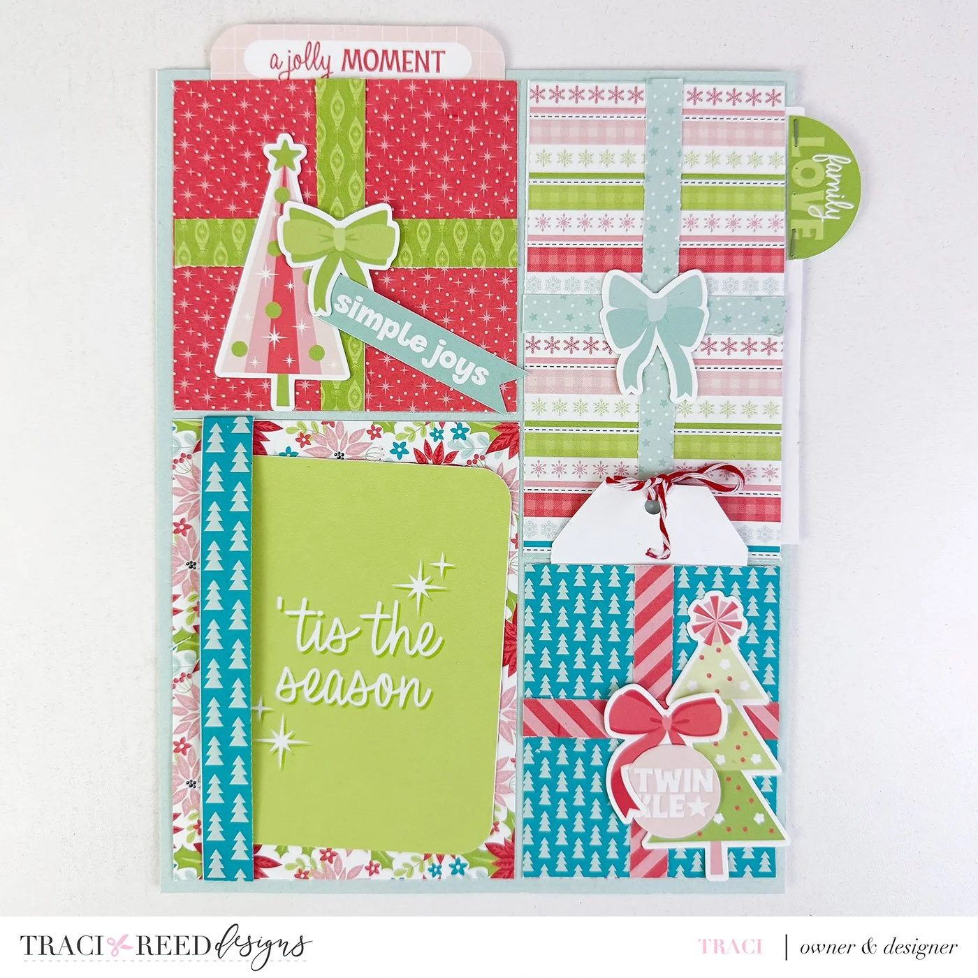 My last (and most complicated) foundation page has 4 presents, 3 of which are small pockets where I can add tags, journaling or photos. The larges present has a belly band where I have inserted a journal card for a title, but I can also add photos too!