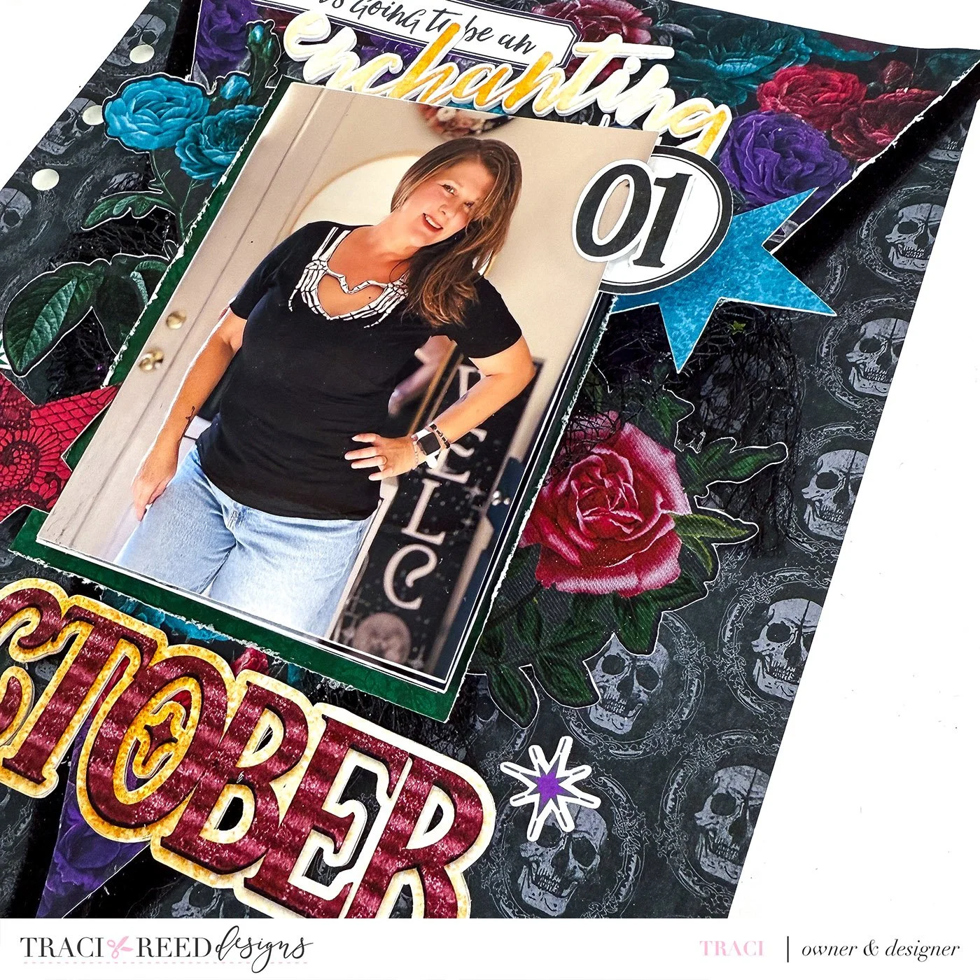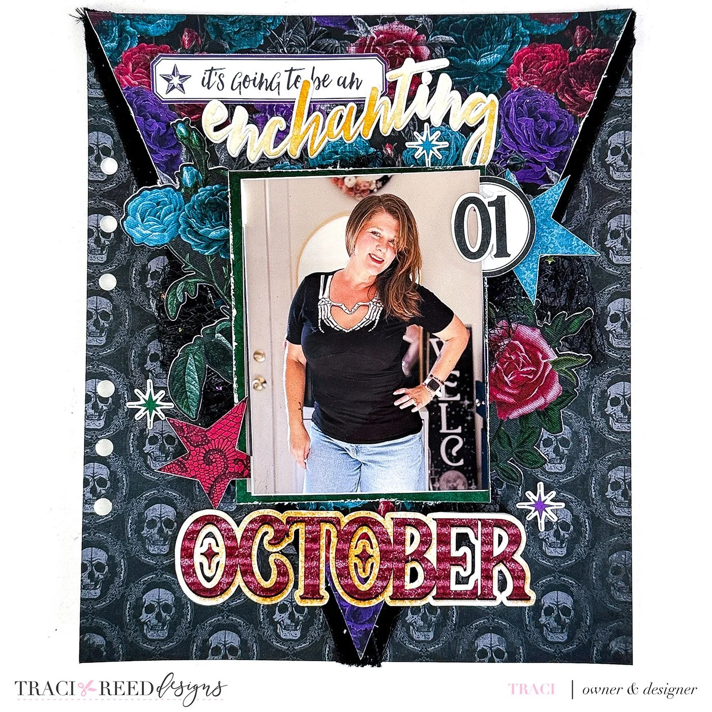 For the title, I used a journal label to type out “it’s going to be an” which I placed above the gold foil “enchanting” from the digital kit, then finished off with “October” at the bottom in the cardboard titles from the digital kit. I backed it with more gold foil to give it a little extra oomph and also make my letters stick together better when I print and cut them!