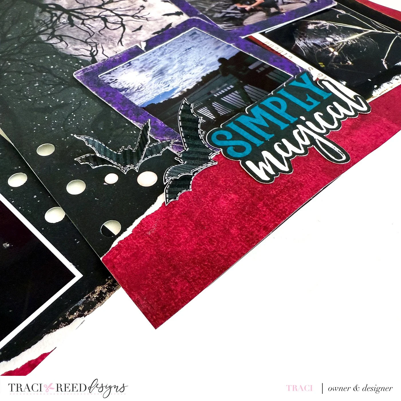 To play up the moon theme, on the right hand side of the spread, I used the large moon paper from the Midnight Apothecary collection and clustered some more of my favorite photos from the hike using some of the frames from the digital kit. I didn’t want to cover up the moon too much so I placed them in the bottom corner and kept the embellishing simple with some bats and a title.