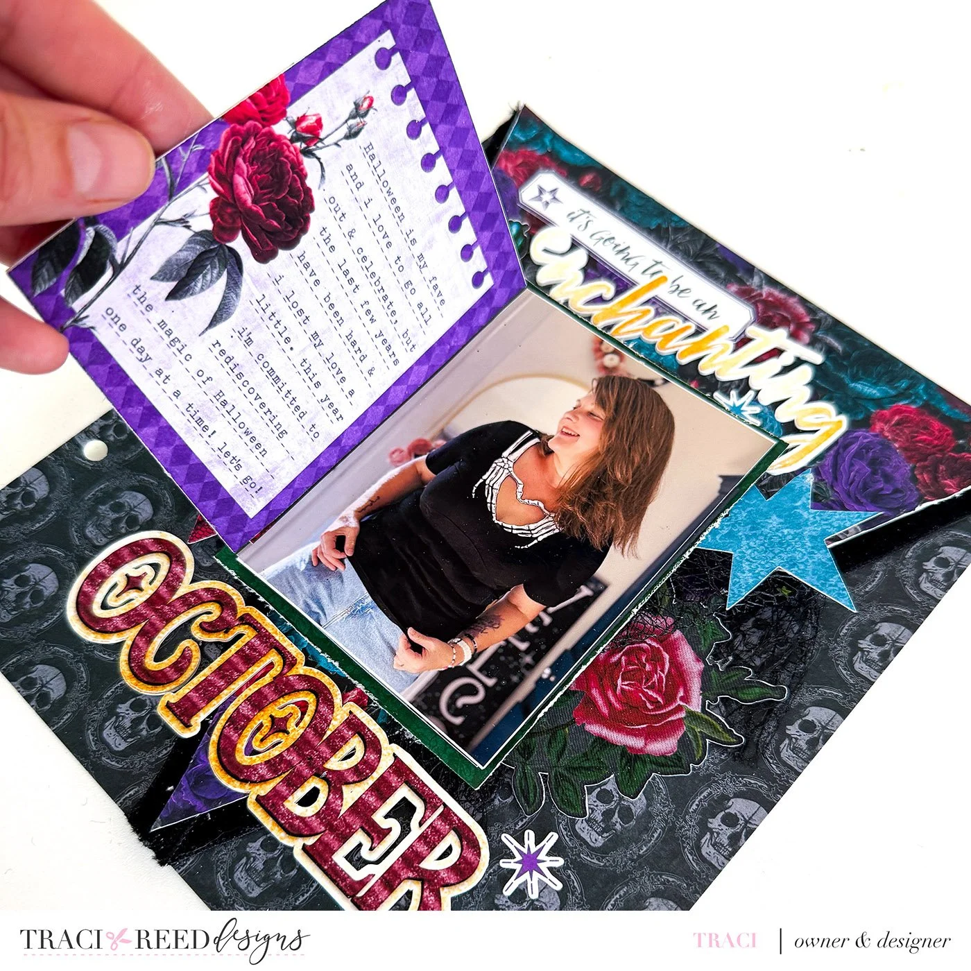 The first page is this album opener that has so much fun color and texture and is, of course, interactive! Often times, people to their “reason why” page for December Daily, but I wanted to do one for October Daily because, to be honest, Halloween is my Christmas!