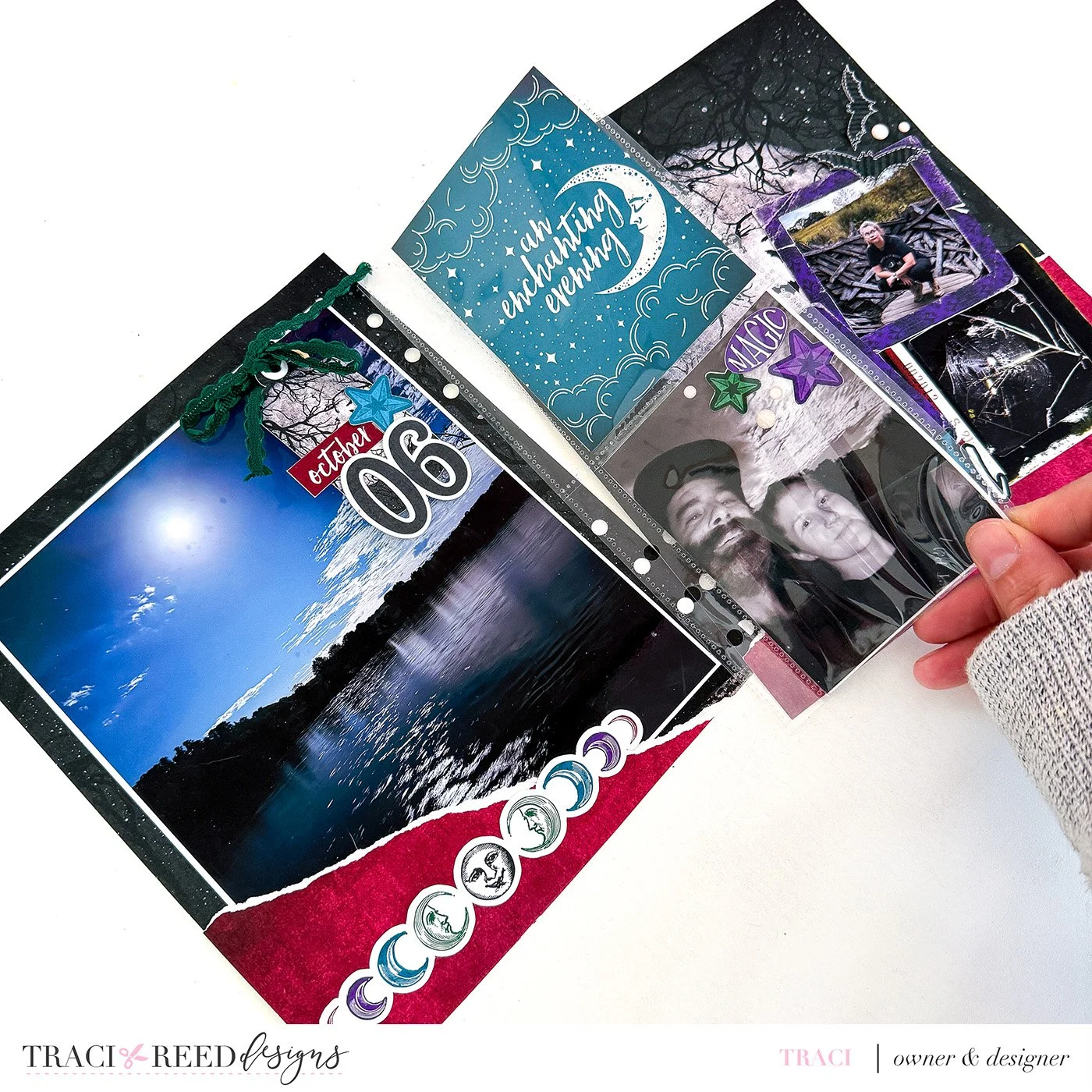 The second page I’ve created with Midnight Apothecary is a full spread that features photos from a full moon hike we went on in one of our local state parks. I thought the moon motif in the Midnight Apothecary collection would be perfect for featuring these photos and I was right!
