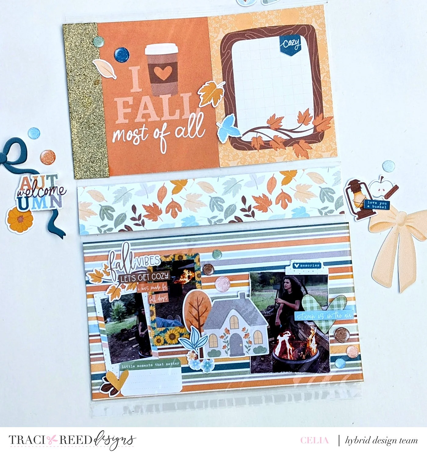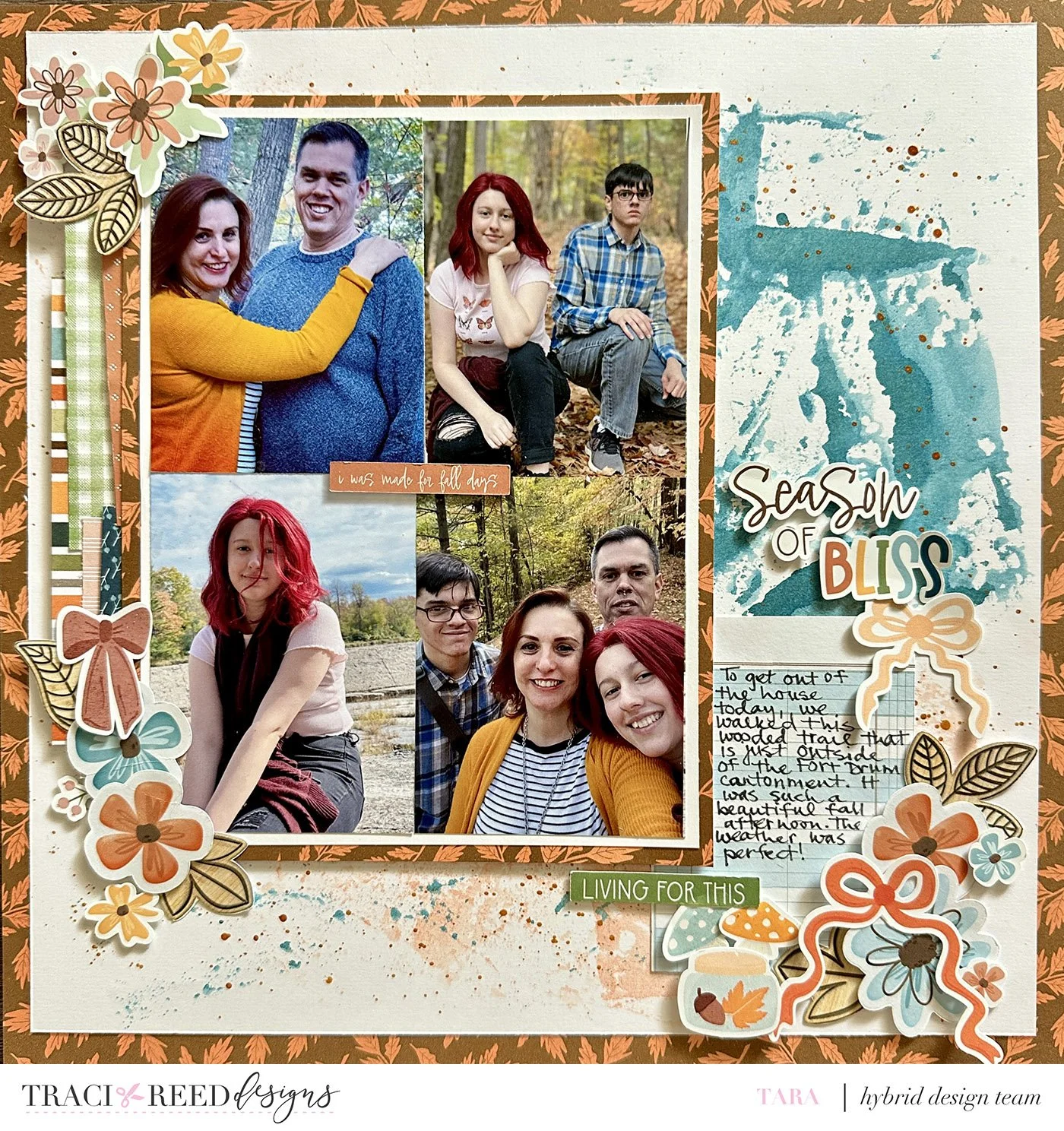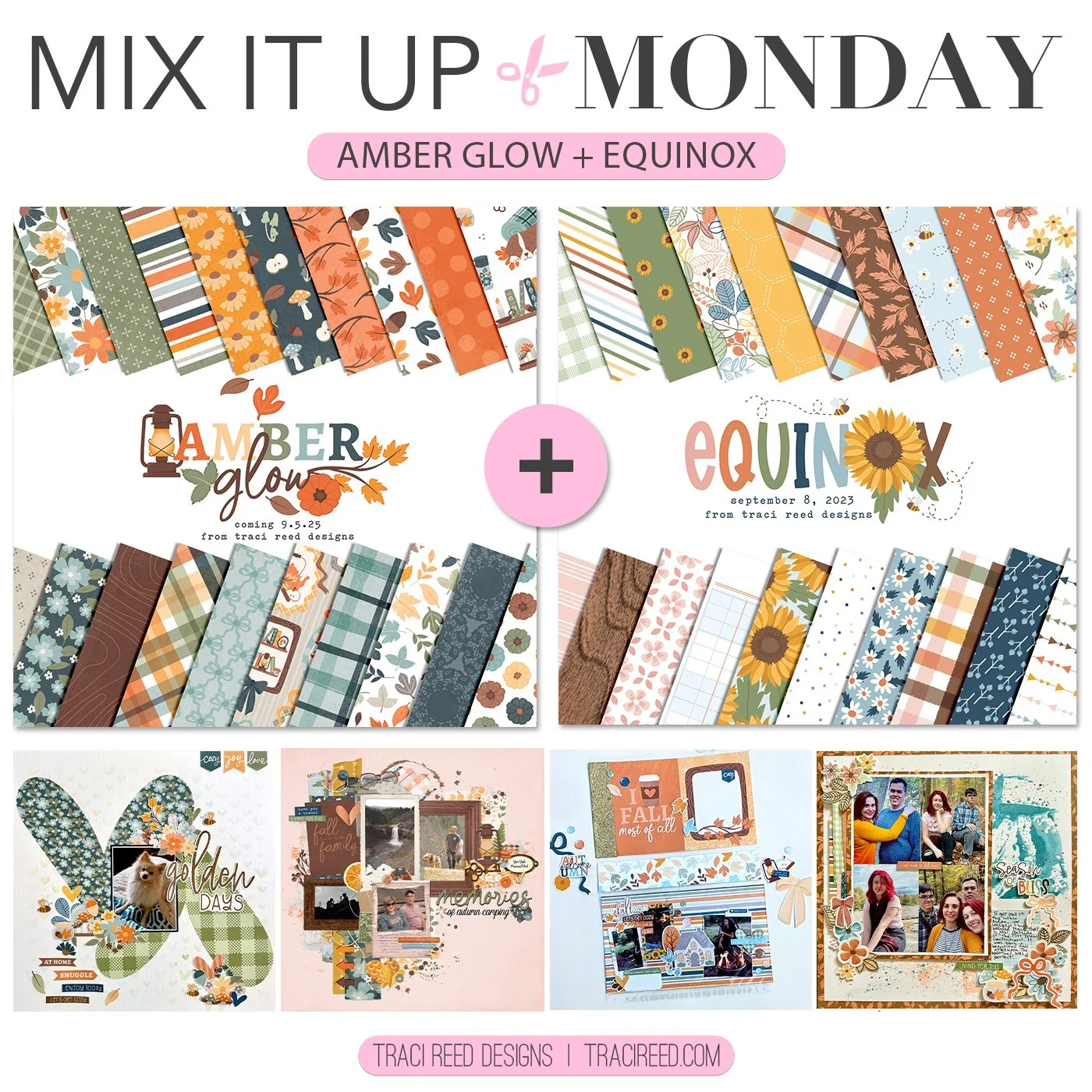 Fall is my favorite time of the year, and fall collections just make me so happy! Today, I am sharing a layout that I created for Mix It Up Monday. This month we are mixing it up with the new release, Amber Glow and Equinox! They meld together in perfect harmony! I used patterned paper from Equinox to create a border around my white background after gutting it. I used the leftover piece to mat my photo grid. I used a title, two bows, mushrooms, and phrases from Amber Glow and layered those items up with florals and wood veneer pieces from Equinox. I layered up some of the patterned cards from Equinox behind my photo grid.