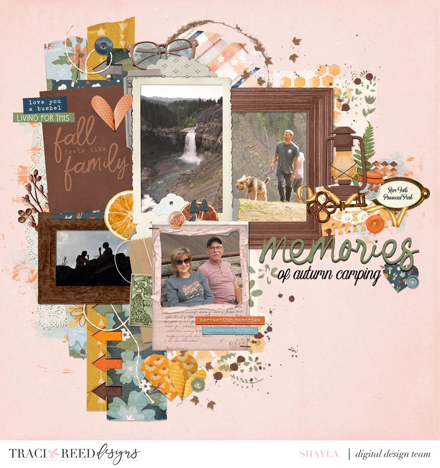 Looking through the digital embellishments and stickers of the Amber Glow and Equinox collections reminds me of browsing an antiques store. Such an eclectic mix of textures and uncommon items. I wanted to bring that junk journal feel to my layout today. I kept the background simple with a solid from Equinox and two journal cards from Amber Glow. The rest of the layout was created by mixing together all the treasures I could find in the embellishments and stickers. I love how seamlessly these two collections mix together.