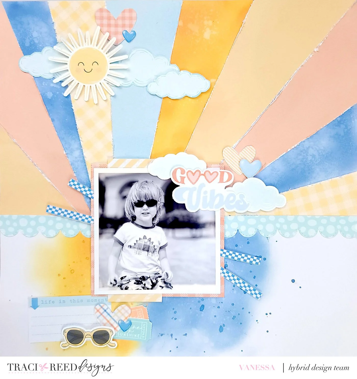 Today for MIUM we are pairing the new Brighter Days and Flower Child collections. These two collections are adorable together. The color tones of each collection coordinate together so well. For my layout I pulled the orange, yellow and blue tones from the two collections to create my page. I love how seamlessly the pattern papers and embellishments pulled together to make a fun summer layout.