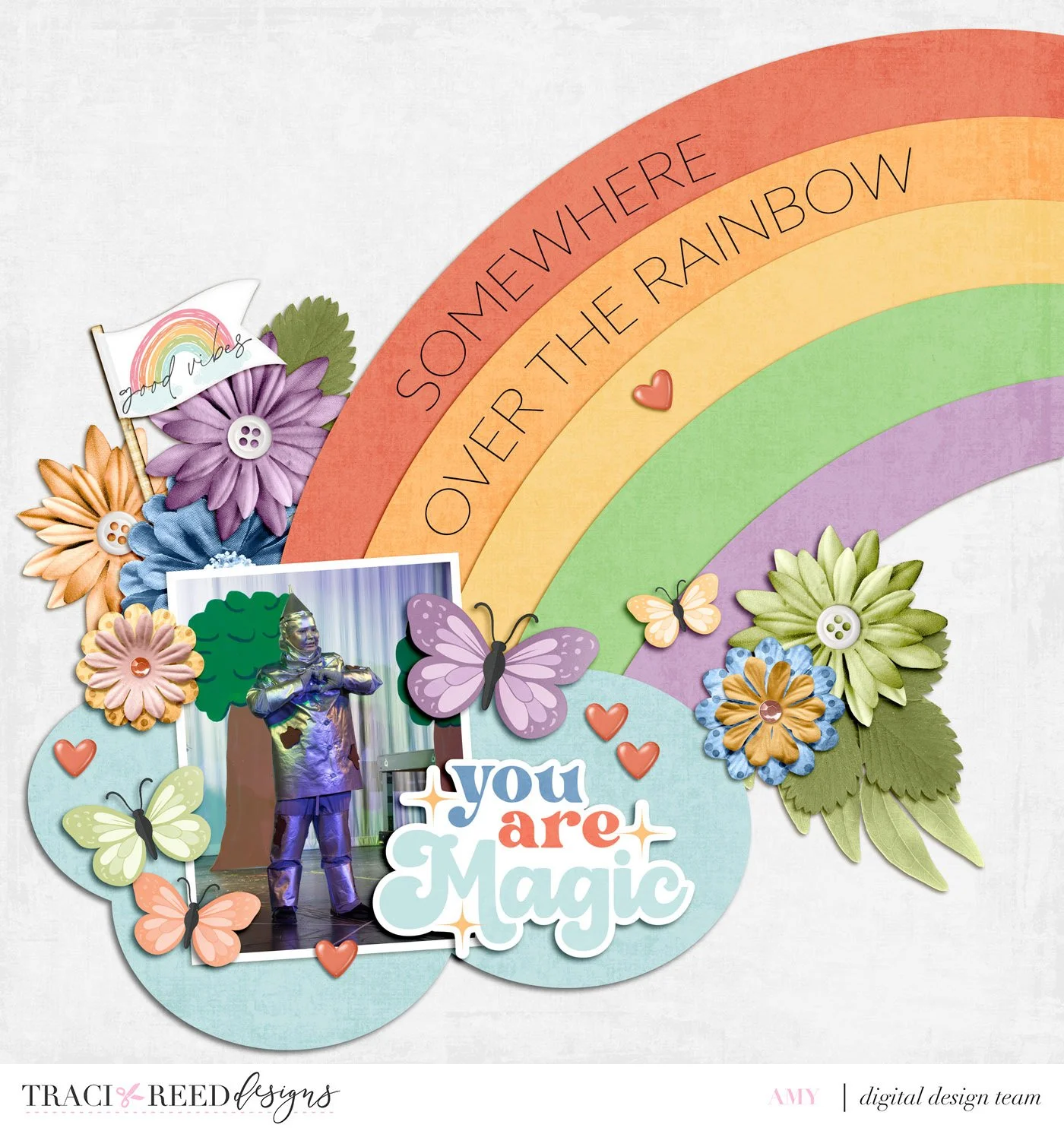 The bright colors and playful elements from both the Flower Child and the Story Foundations: Brighter Days kits along with Template #773 by Lynnette Penacho from Simple Scrapper felt like the perfect match for a page about the Wizard of Oz! The rainbow on the template mixed with the embellishments from the Flower Child & Brighter Days kits naturally led me to the title, “Somewhere Over the Rainbow, You Are Magic,” which captures exactly how proud I am of him and how magical it feels to watch him shine on stage!