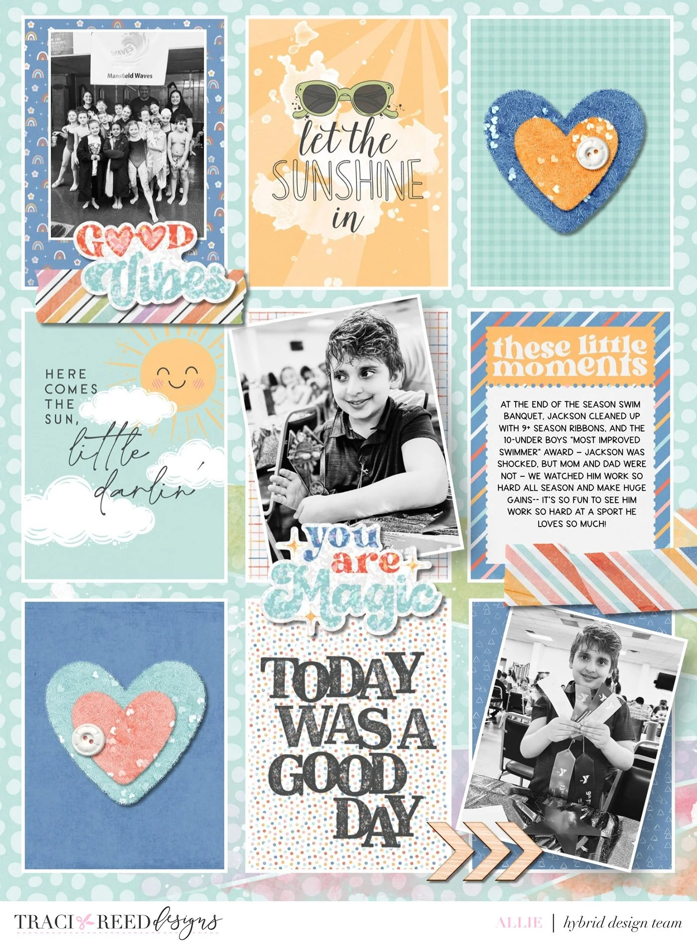 For my pocket page, I wanted to document my son’s recent “swim banquet” so I used a lot of the light blue pages — both kits had a ton! Flower Child even had one that looked like bubbles, so I added that to my background. I loved the encouraging “stickers” from Flower Child, so I made sure to put those on the page celebrating my son! (And of course, I had to add rainbows and hearts from both kits for pops of color! I loved that “sunshine” was a running theme, because I call him my sunshine!)