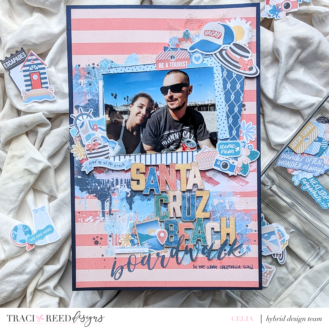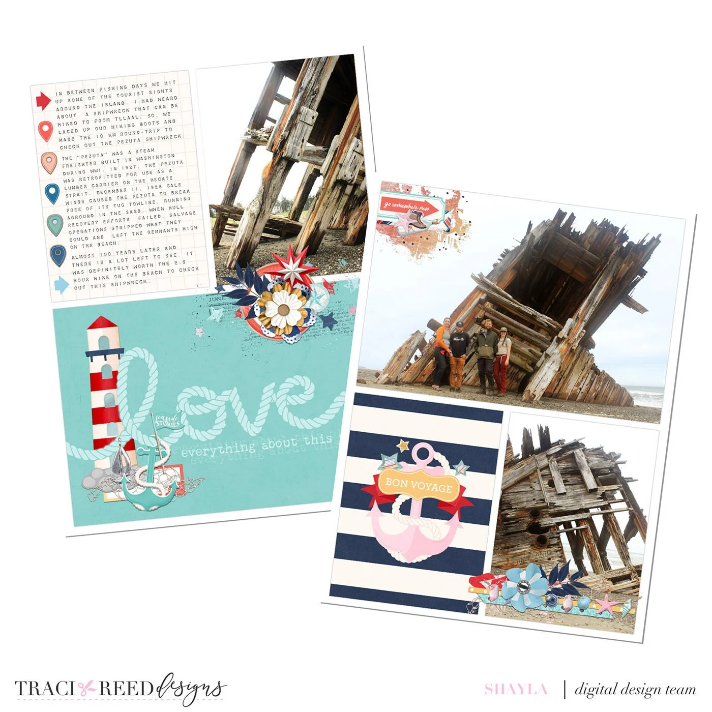 For this mix up of collections I started with a base of journal cards from True North and then used embellishments from both collections to paint a picture that complemented my story. Wander & Wonder had shades of red and orange that pulled out tones from my photos to make them pop. I like adding elements to journal cards like the ‘Bon Voyage’ tag to give it my own unique spin. For the title card, I duplicated the card layer and used the eraser tool to digitally make it appear as though ‘Love’ was added over top of the embellishments and to make it appear as though the anchor was threaded to the word.
