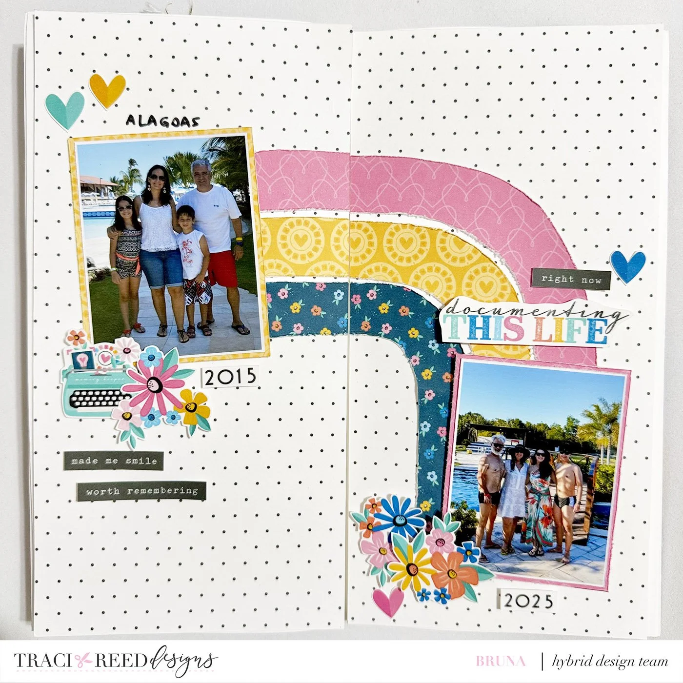 That's what I did on this TN spread! I used a base paper from Story Foundations and cut strips of colored paper from Our Story Matters to make a large rainbow that went from one page to the other, and I put a before photo on the left side and the now/after photo on the right side.