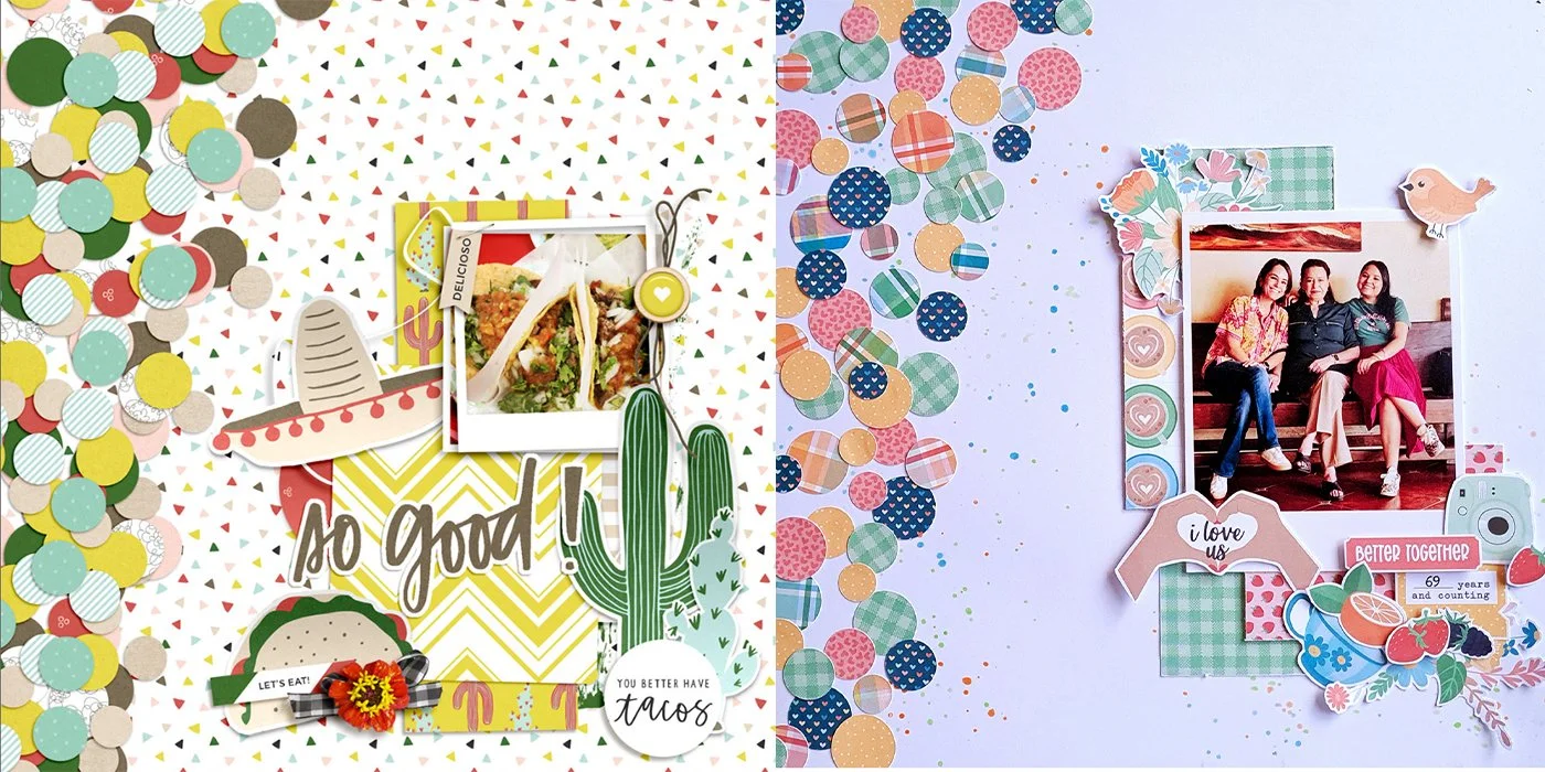 I loved this project from Danica's gallery. My favorite part of the composition is the confetti corner made with patterned paper circles, I found this idea super fun! I used the Besties who brunch collection to make my interpretation of this layout since I think it works perfectly for a birthday project. I changed the size of my photo and made it bigger but kept the polaroid frame as the original design and the result is just amazing!