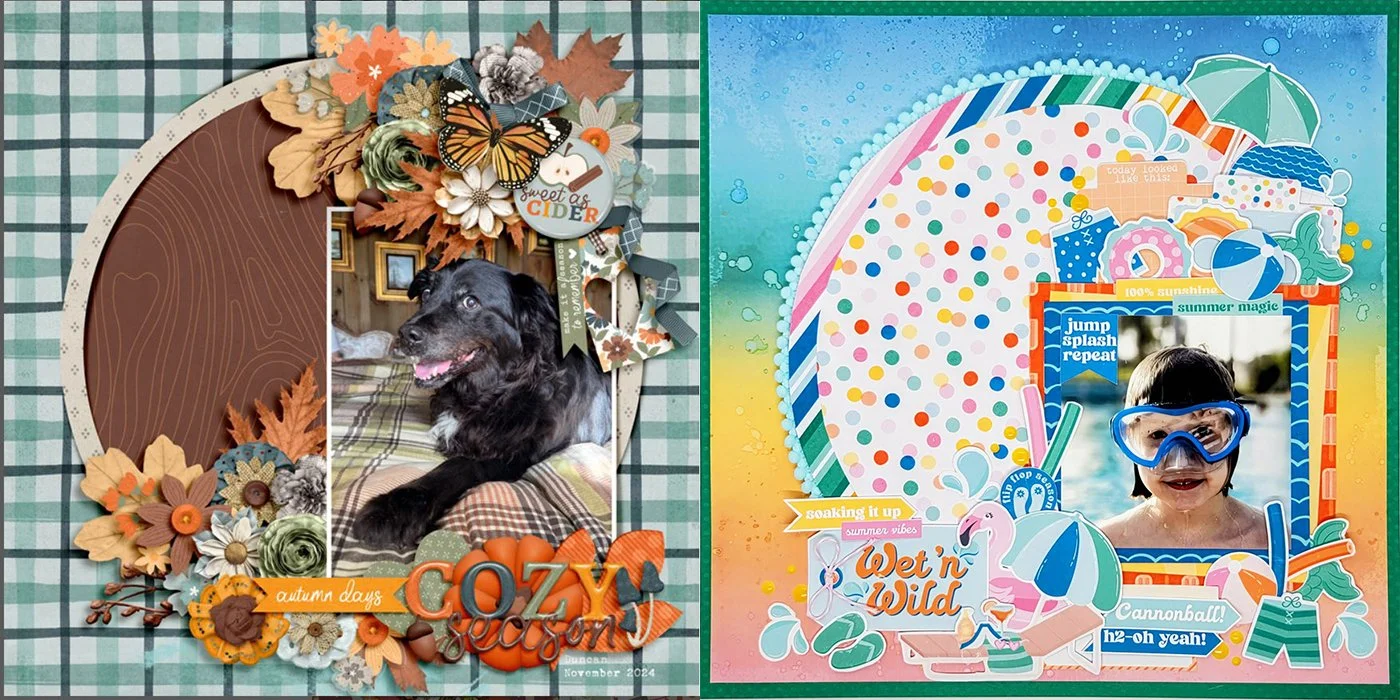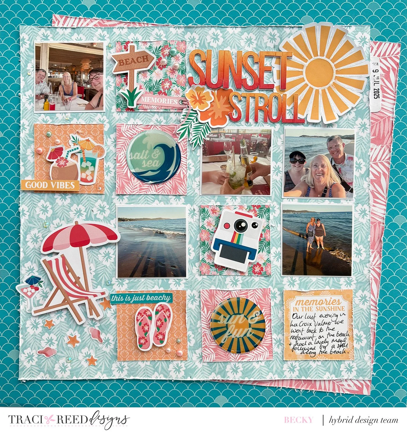 I have a more clean scrapbooking style so this design from Danica got my heart! I’ve used the Island Time Collection and it is so fun and has bold colors! I love it! And the digital kit has amazing background elements like those little grains of sand and frames to enrich and incorporate in your projects!