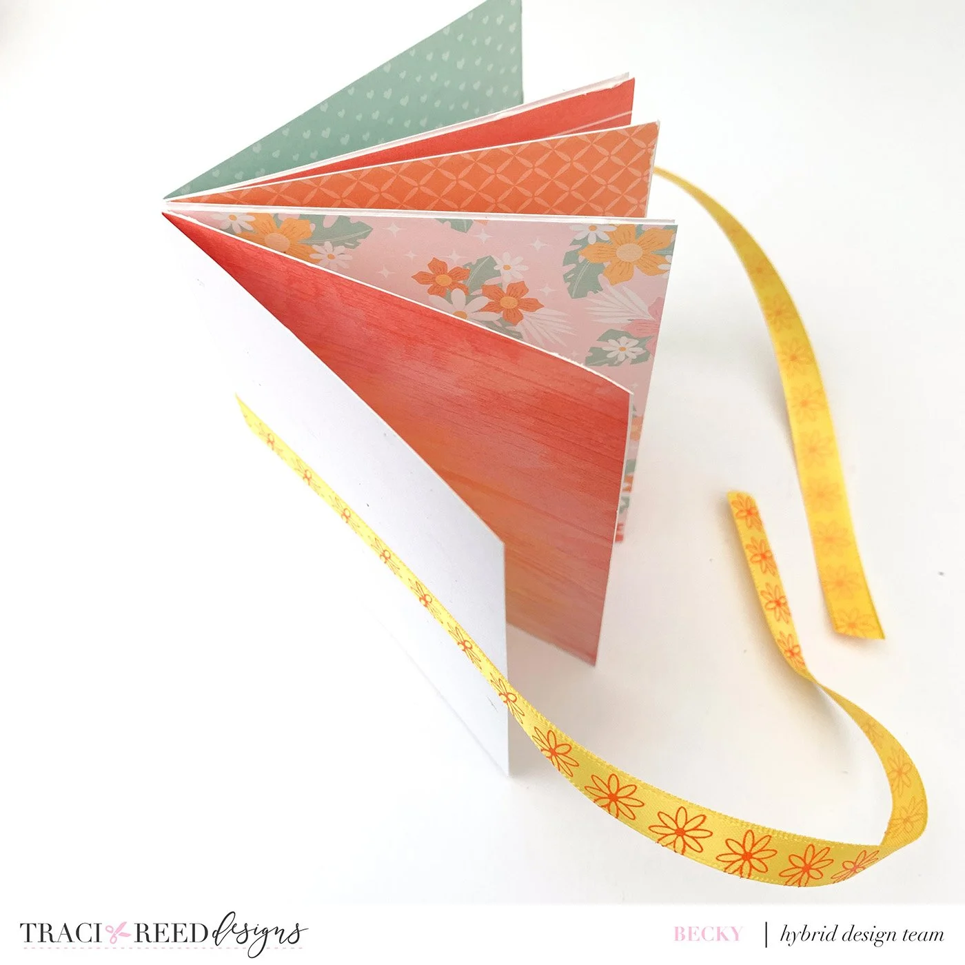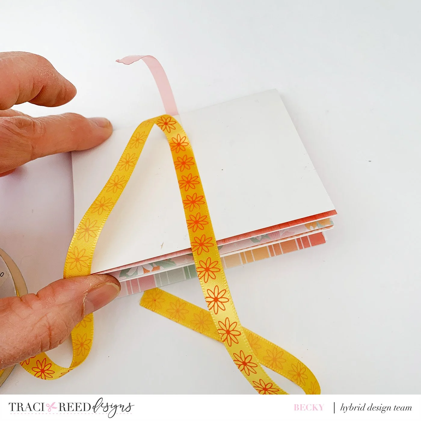 I then scored these cards at 3” along the long edge and folded them in half and stuck them back to back to form the booklet. I then stuck some double sided tape the front, spine and back and added some ribbon to this to be a tie closure.