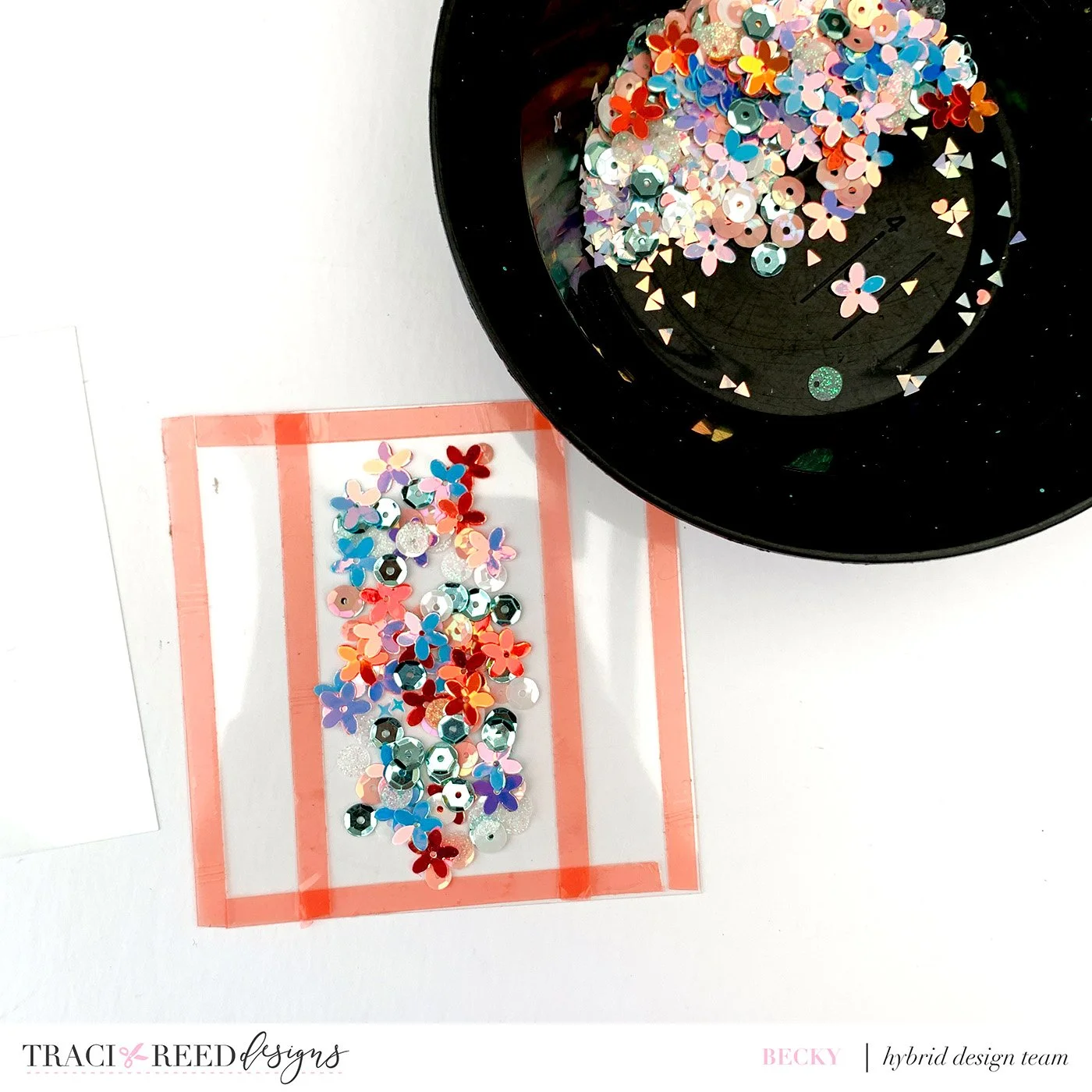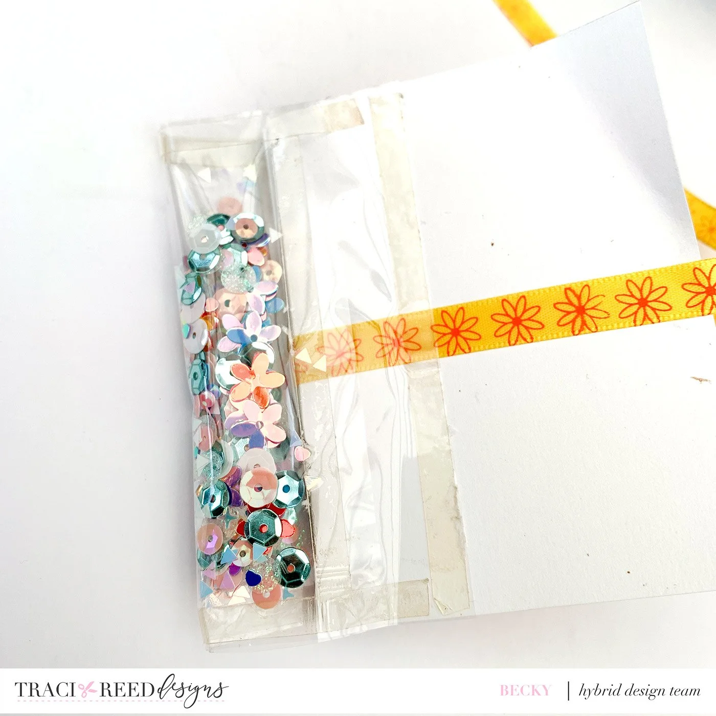 For the spine I took some acetate (not too thick as it needs to bend easily, mine was from around a scrapbook collection pack) and cut it to 4” square. I then added tape on all 4 sides and then at 1” from each side to make a channel in the middle. To this channel I added the sequins.