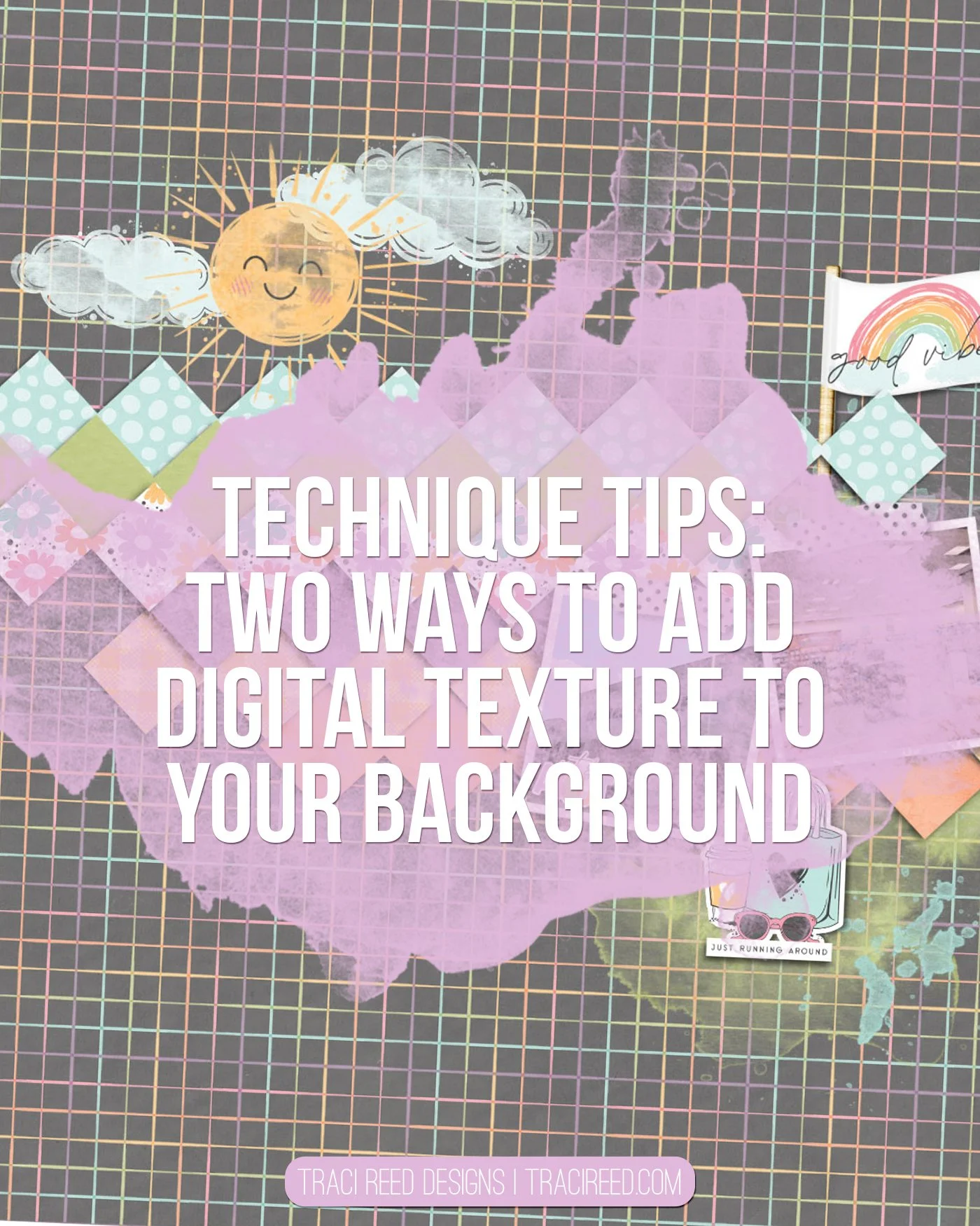 When it comes to creating digital layouts I always have two go to things that I do. One is making the background one of the colorful or busy background pattern papers. Then add a vellum overlay. I will often turn the transparency to 50% or a little lower depending on the design and layout. The vellum overlay I use has some texture to it.