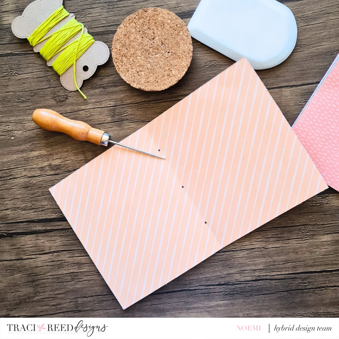 Next, I folded the cover in half and marked the center with a pencil, which would be 2.5 inches, then marked one inch up and one inch down. I used the cover as a template to punch my three pages at the same distance.