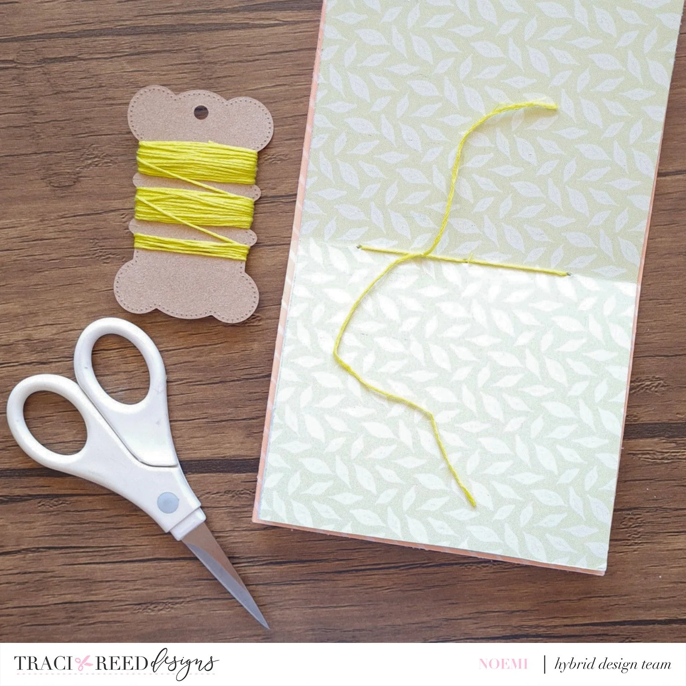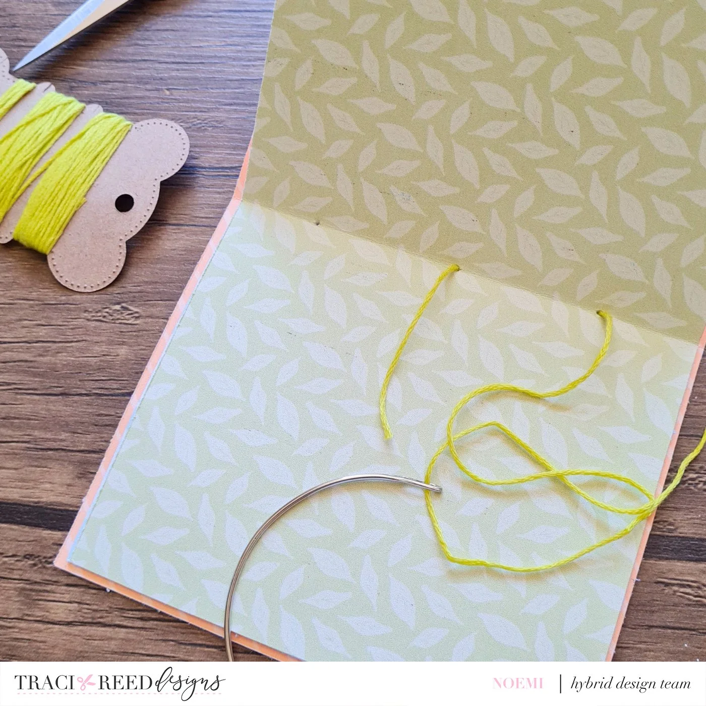 This binding is very simple. Once all the pages are punched, insert the needle through the middle hole from the inside of the album, leaving a long enough tail to tie at the end. As a tip, your thread should be about three times the height of your project, so I used a 15-inch thread. Then, insert the needle back through the top hole from the outside to the inside, return to the center, go down to the bottom hole, and finish with a double knot. I like to add a drop of glue on the knot for extra reinforcement.