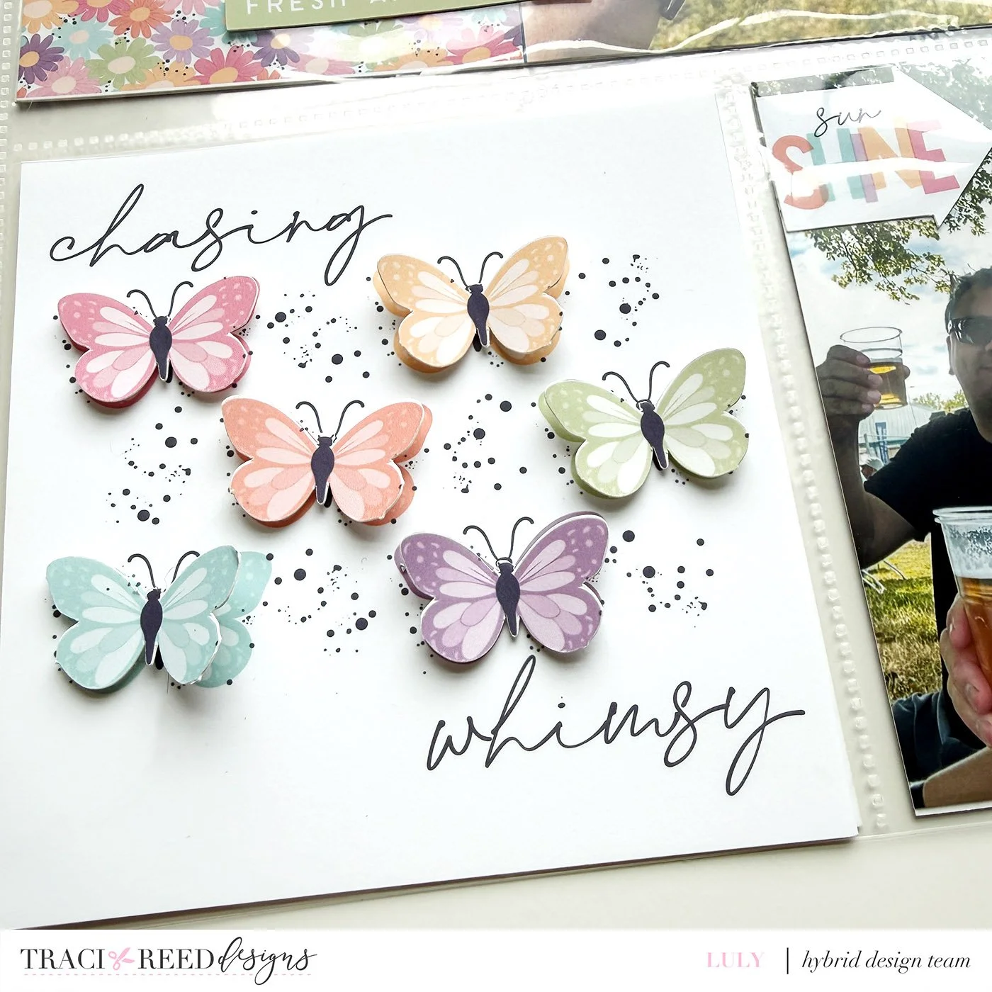I created a ton of texture on these pages using lots of different techniques. On this page I layered a 2nd set of butterflies over my journaling card and popped up the wings with little dimensionals underneath. Size this page is on the left side of my album – I actually attached this card on top of the page protector – don’t be afraid to do this with strong adhesive!