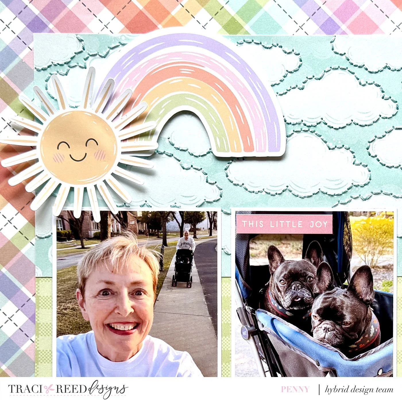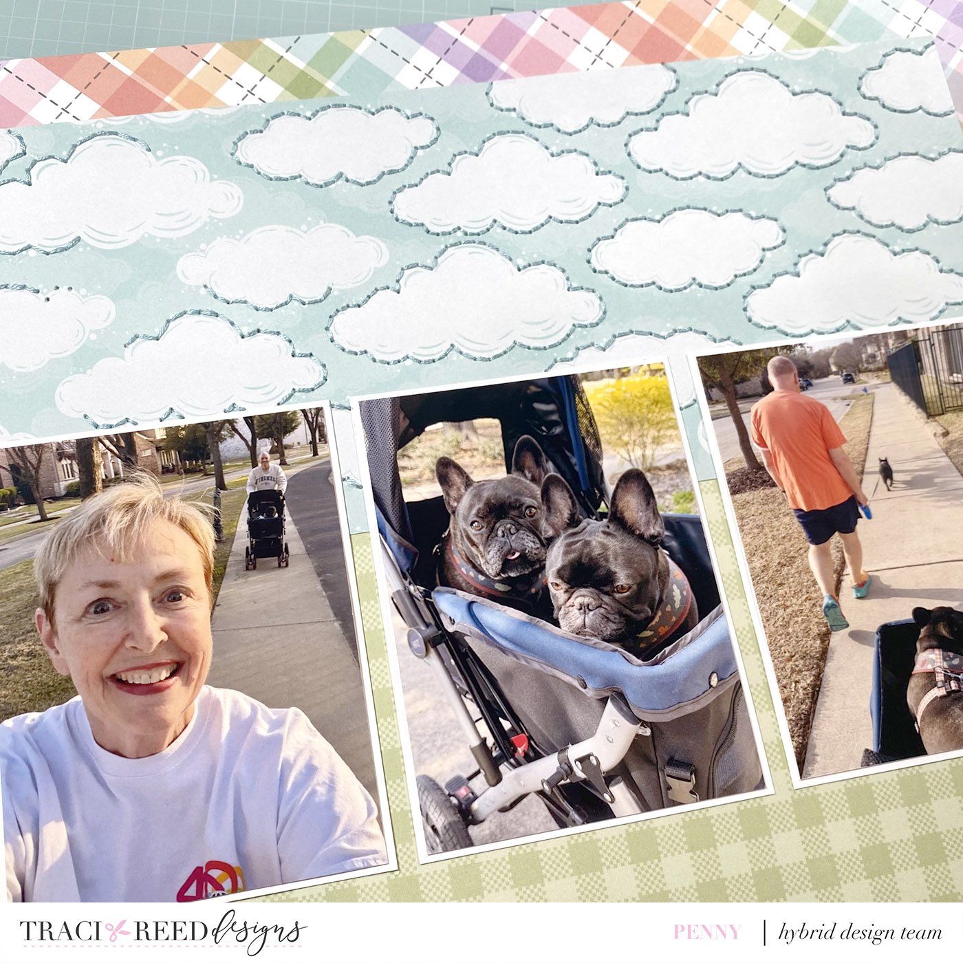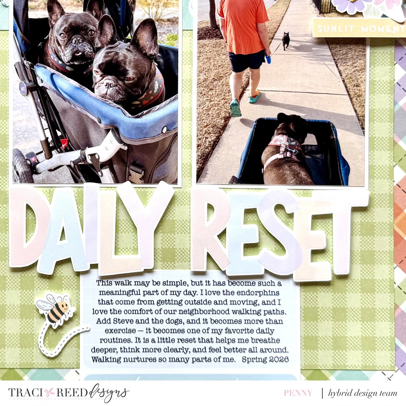 Today I’m sharing a layout created with the Story Foundations Chapter 4: Brighter Days collection from Traci Reed Designs. This page tells the story of one of my favorite daily routines — walking through the neighborhood with Steve and the dogs — and how such a simple habit brings fresh air, movement, and a much-needed reset to my day. This collection seemed perfect to document how brighter days and time in the sunshine are part of my daily reset.