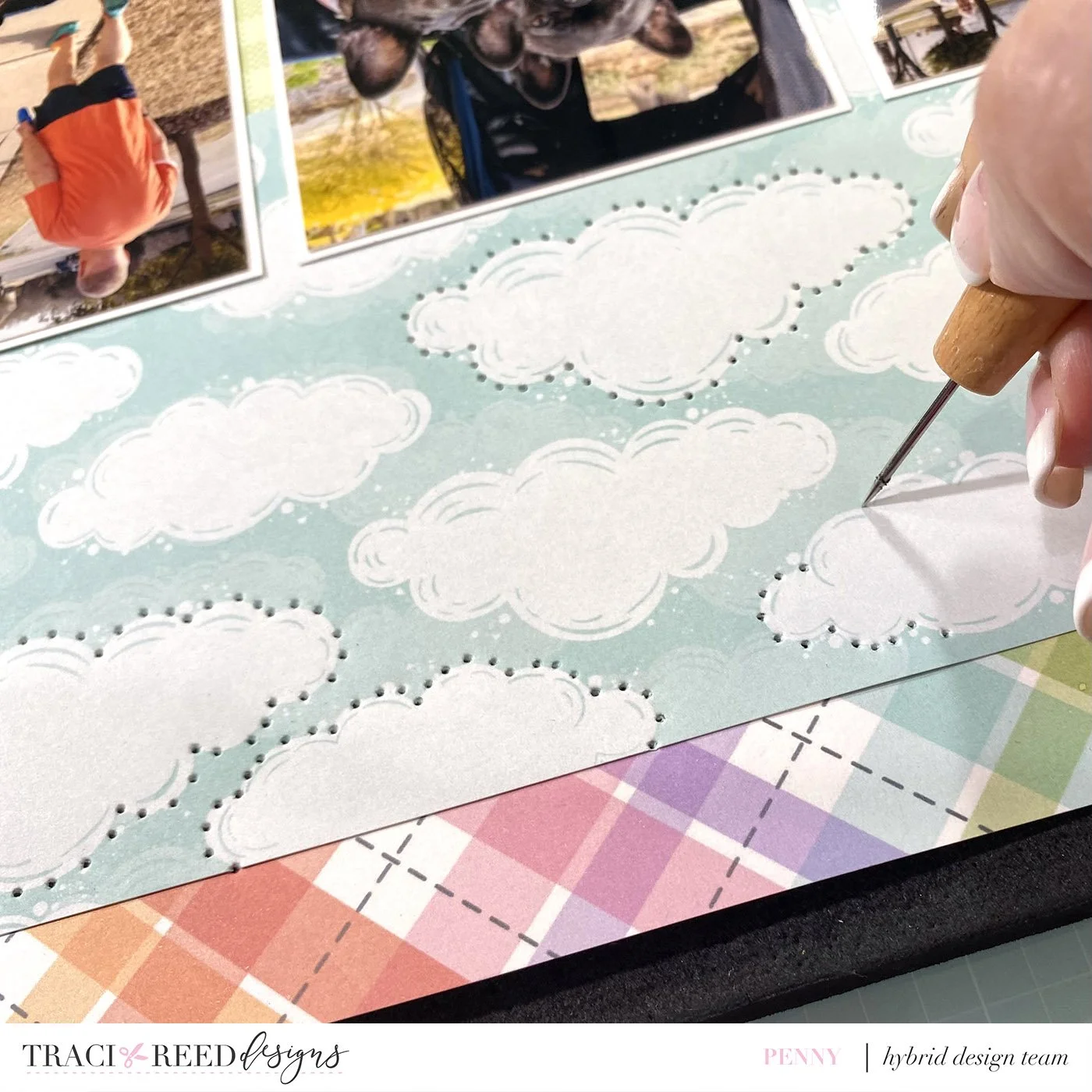 I began by piercing around the cloud shapes that would be visible when the layout was finished. I wanted the stitching to create texture and movement across the background, and elected to do all of the clouds rather than just a few. Taking care to pierce enough holes to clearly define the cloud curves, I worked cloud by cloud. Once the holes were in place, I hand stitched around the cloud outlines using embroidery floss. That simple step added so much more texture than the flat paper had on its own. It also helped emphasize the airy feel of the background and made that whole top section of the layout feel more intentional.