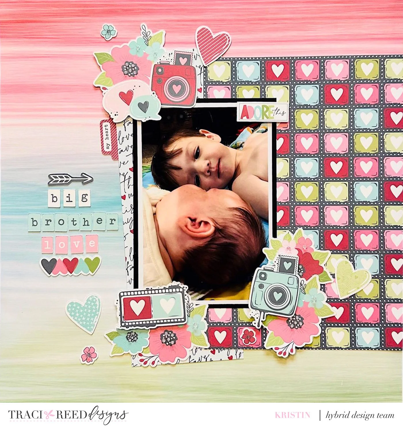 Awww is there anything sweeter than baby siblings? Kristin’s layout captures that love so well and the black tones in the papers she chose match her photo so well!