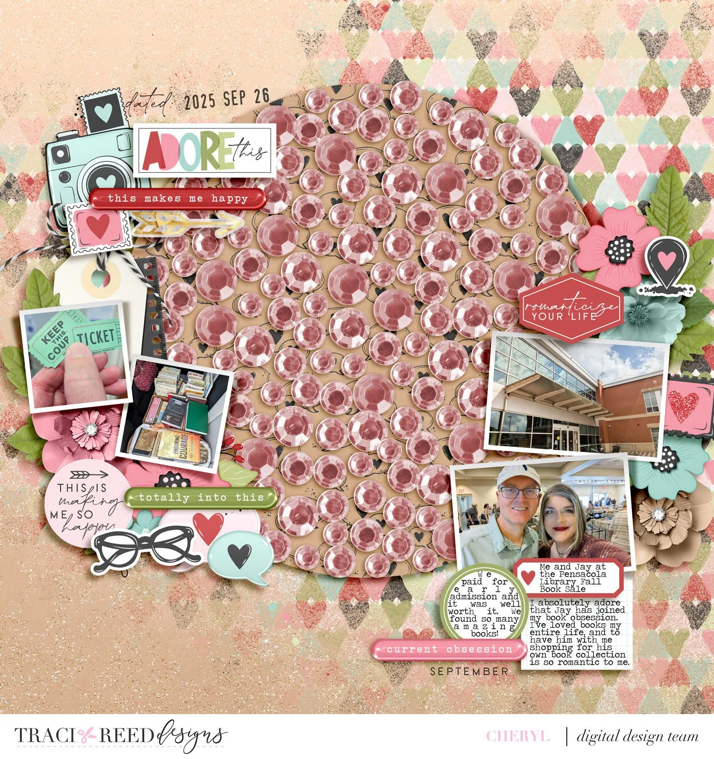 Chery’s layout is blinging thanks to her new templates and the de-centered photo clusters are really fun! I love the way she’s turned the heart paper into mixed media in the background as well!