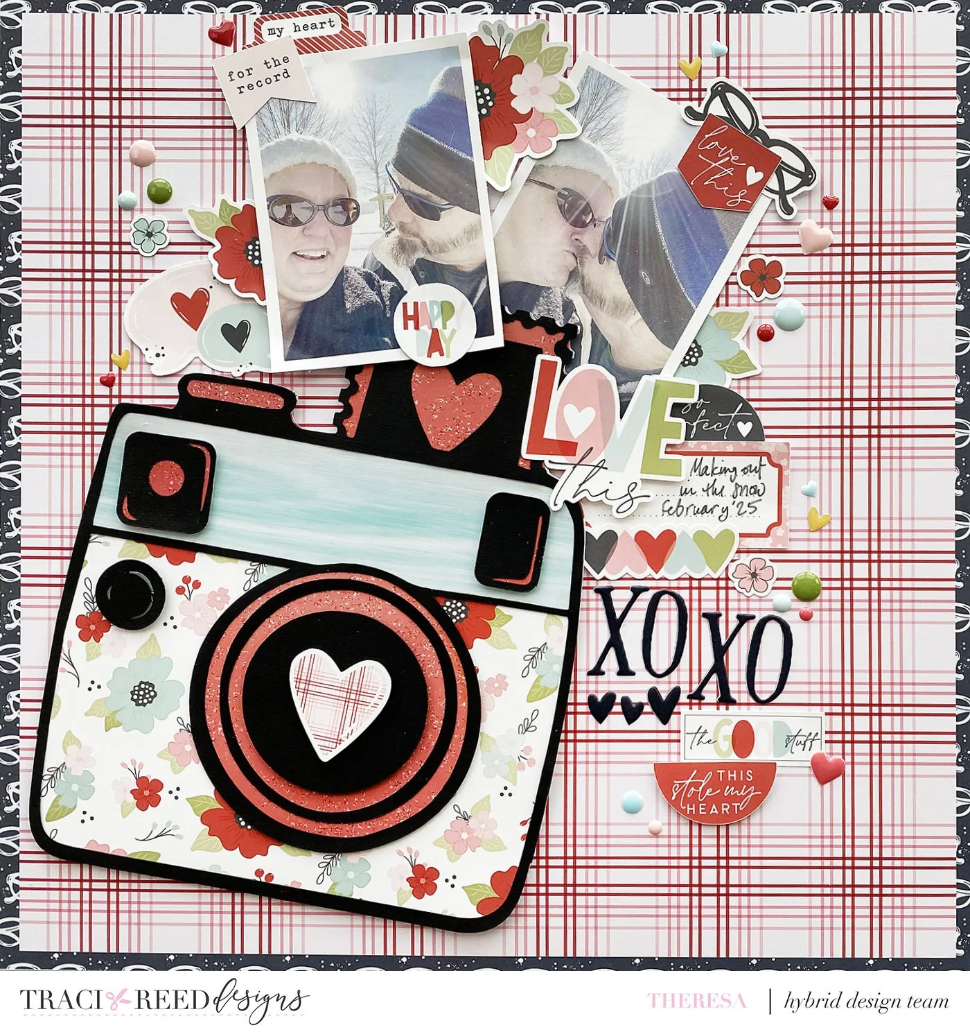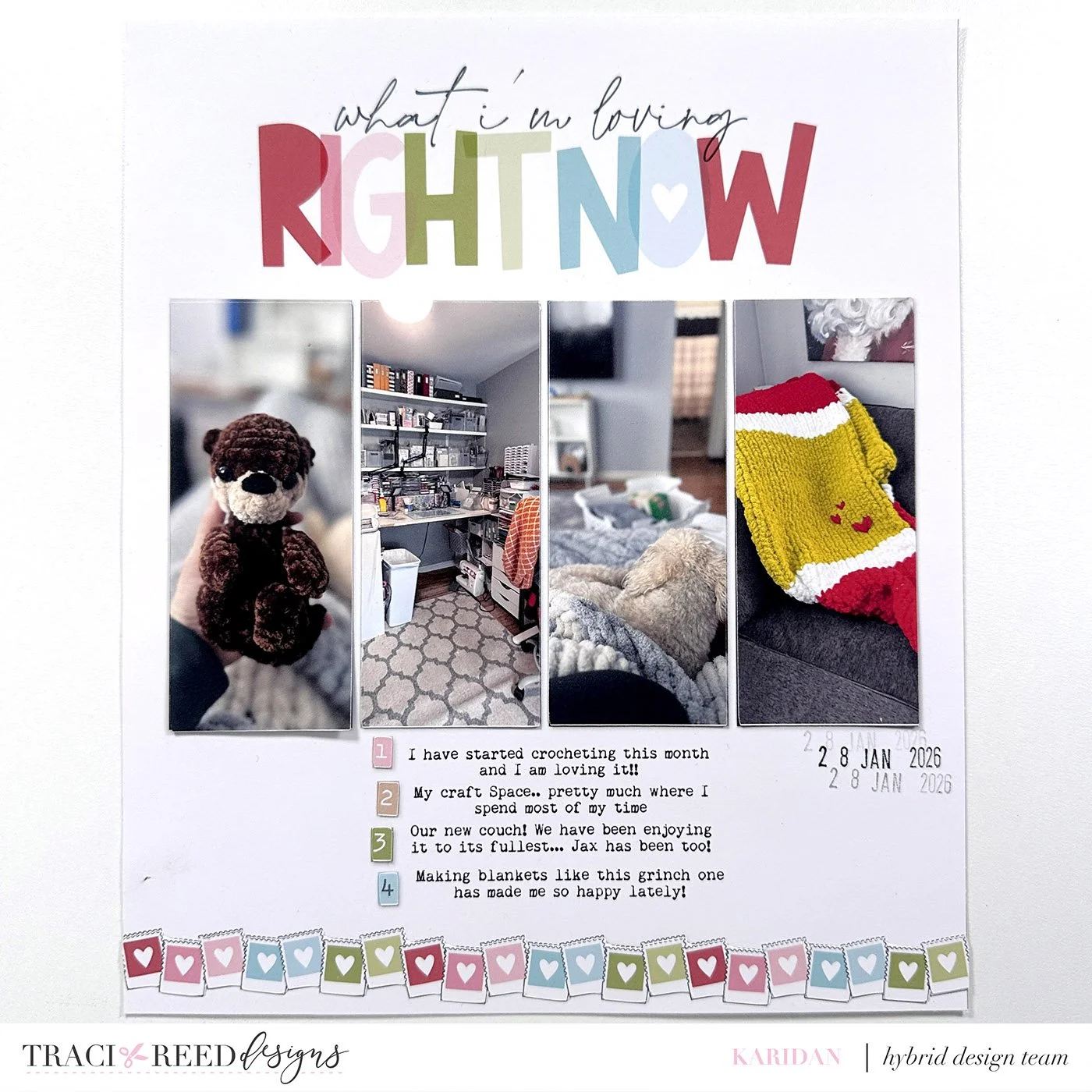 Is there anything better than a new puppy? Caroline’s enjoying being a new dog mom and her baby is so cute! The repetition on this page with color and those heart film strips is perfect!