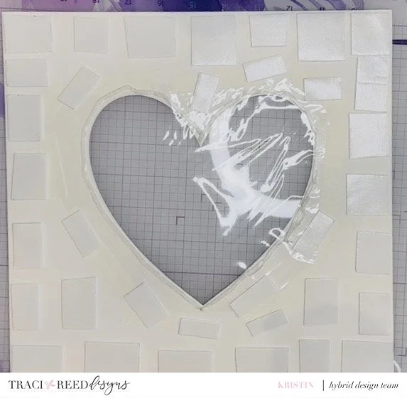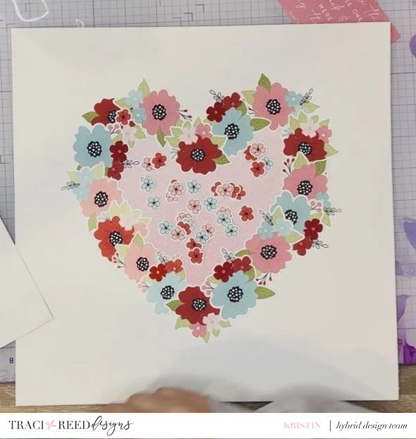 Once I cut out the heart, I set about creating the shaker pocket. I adhered some plastic to the back of the heart cut out. I then took another scrap piece of cardstock and placed the pink ombre glitter paper on it and surrounded the heart with those beautiful florals in the Routines Stickers set, this would be what you would see behind the heart cut out. I print then cut several of the little flowers included in the Routines Stickers and placed them on the pink heart...these would be my shaker element in the pocket.