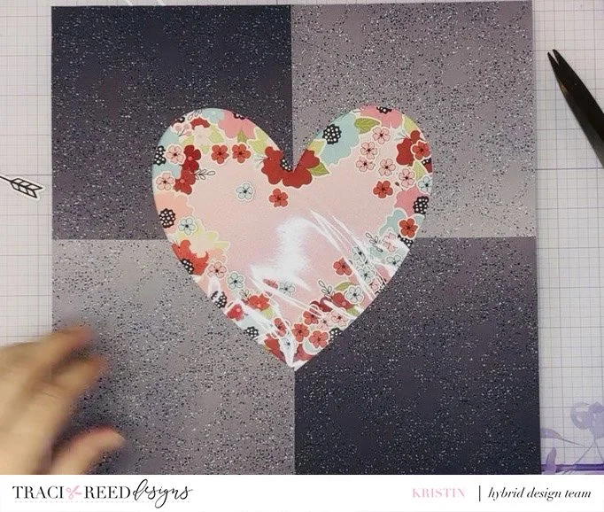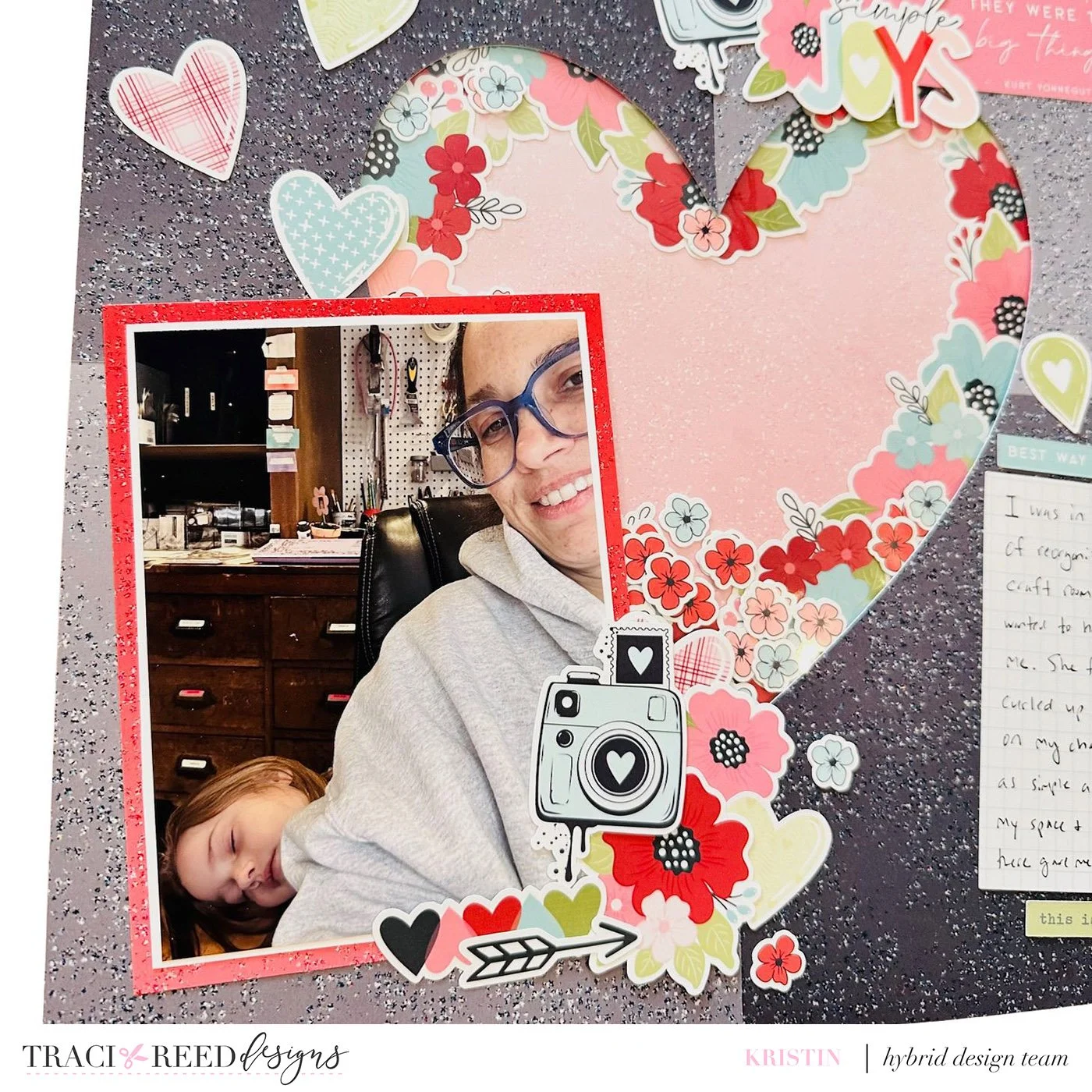 What better way to document a layout that captures that feeling than to use Traci's brand new Faves collection! I also wanted to challenge myself on this layout and played along with a challenge which asked you to use: 1. 4 6x6 papers 2. Arrows and 3. the title "The Little Things." I also wanted to challenge myself by creating a shaker pocket--something that I am trying to improve my skills on. So I chose the black ombre glitter paper as my base paper--I cut it into 4 6x6 papers and adhered them to some scrap cardstock in my stash to meet the first challenge requirement. I found a heart cut file on Cricut design space and cut it out in the center of the layout using my Cricut. I chose the black ombre paper because I knew I wanted to back the heart cut out with the pink ombre glitter paper and I wanted the heart to stand out on