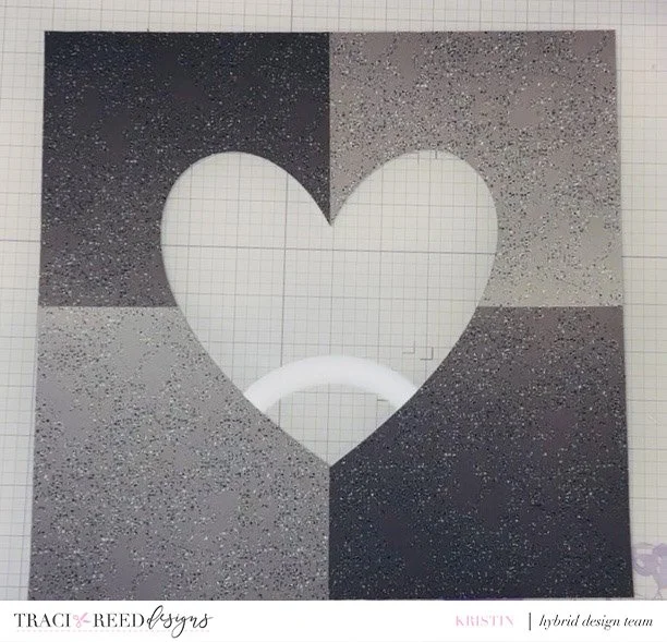 I placed a thin layer of foam around the entire heart cut out on the back of the black ombre glitter paper so that the shakers would stay in place in the shaker. I then applied foam to the rest of the back of the black ombre glitter paper. I adhered both papers together...being careful and mindful to line everything up. My shaker element was completed...now onto embellishing!