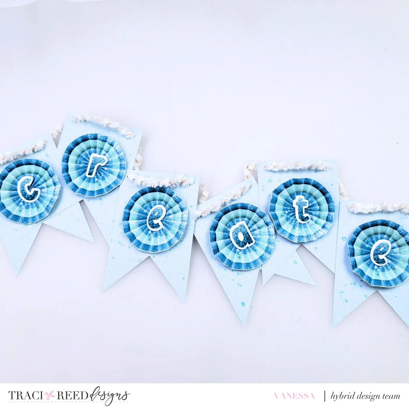 To start I printed the light blue grid paper and using a banner cut file on my electronic die cutting machine I cut my banner. Next, I printed from the digital kit letters in the Navy alpha to spell the word “create” as well as the blue tone on tone pinwheels from the digital embellishments.