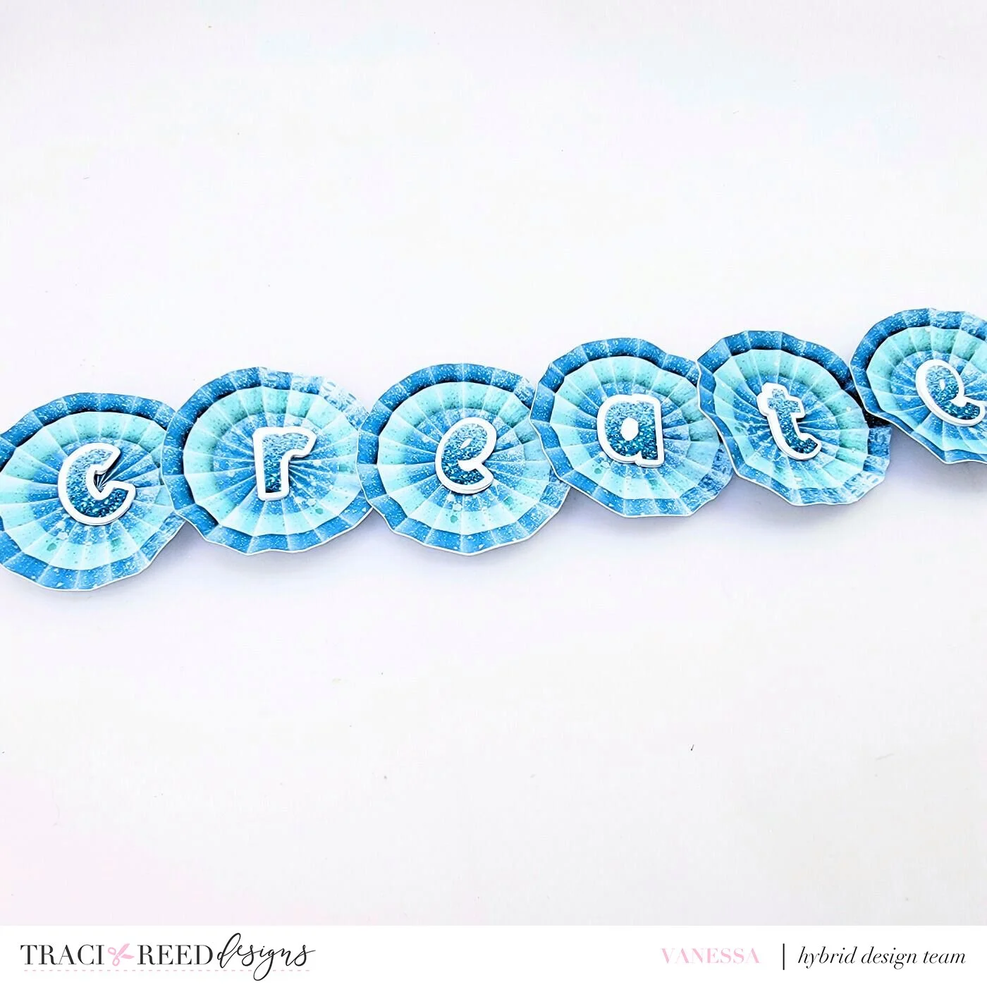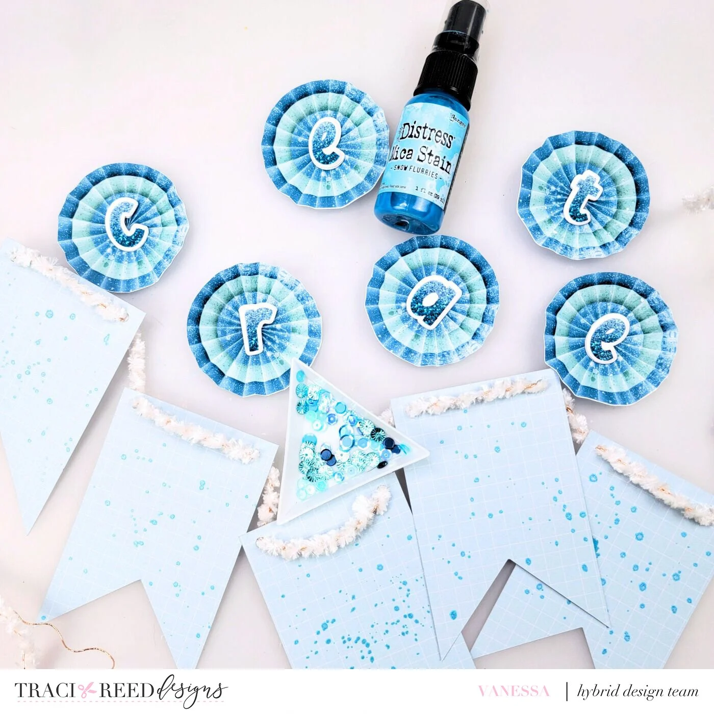 To finish off the banners I added some additional sparkle with some sequins in several shades of blue. The finished banner is a fun and sparkly new addition to my scrap room décor using my favorite colors. I hope this quick and easy home décor project has inspired you to grab a digital collection and create your own scrap room banner. Be sure to share what your create and tag #tracireeddesigns so we can see what you create.