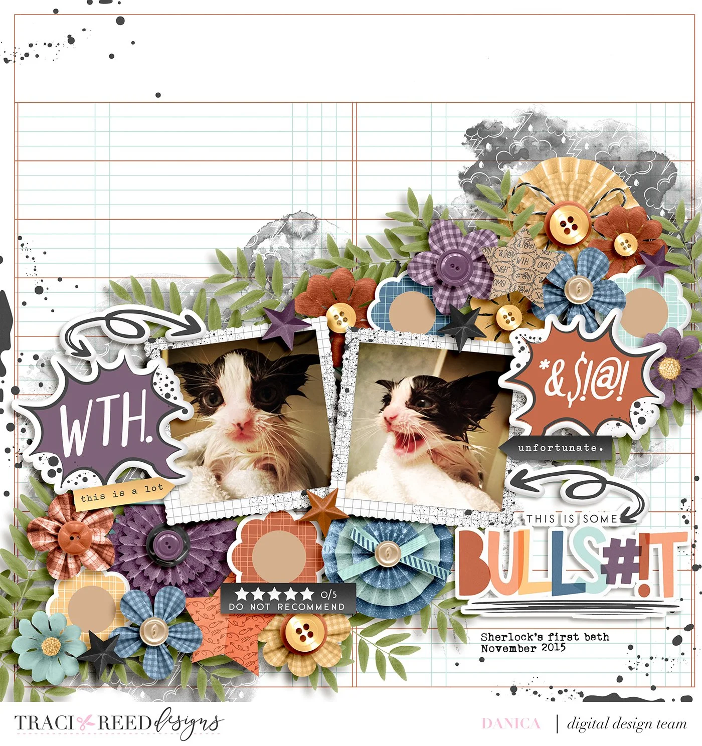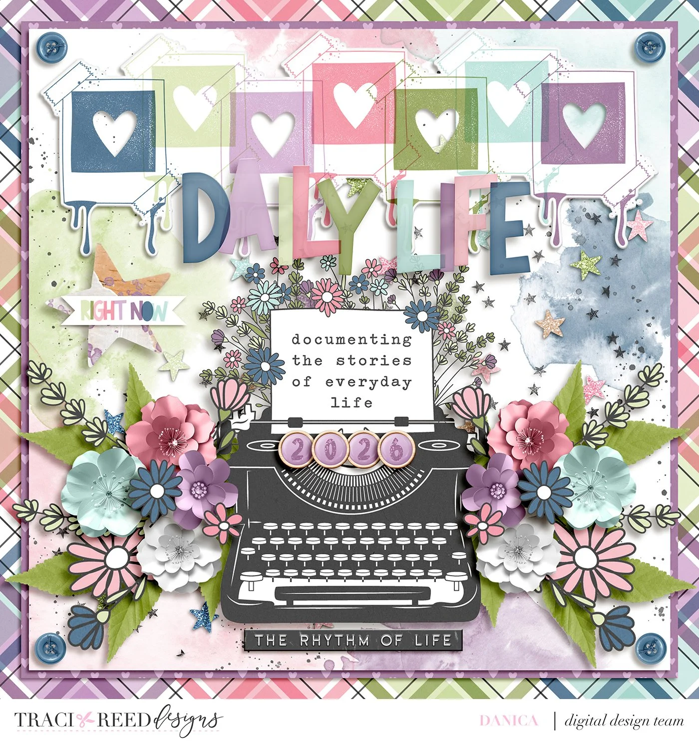 Symmetry is another great way to create a cluster. I use this technique when I want to surround my photo or focal point with a cluster. This is the technique I used in my second layout. I used Traci’s Routines collection. I did not use a template. If you look closely you can see the cluster to the left of the typewriter is exactly the same, but a mirror image to, the cluster to the right of it. When using this technique, sometimes I will also extend the cluster across the bottom of the focal point which creates a pocket for it to rest in. I opted this time to just use the word strip instead of a garland of flowers.