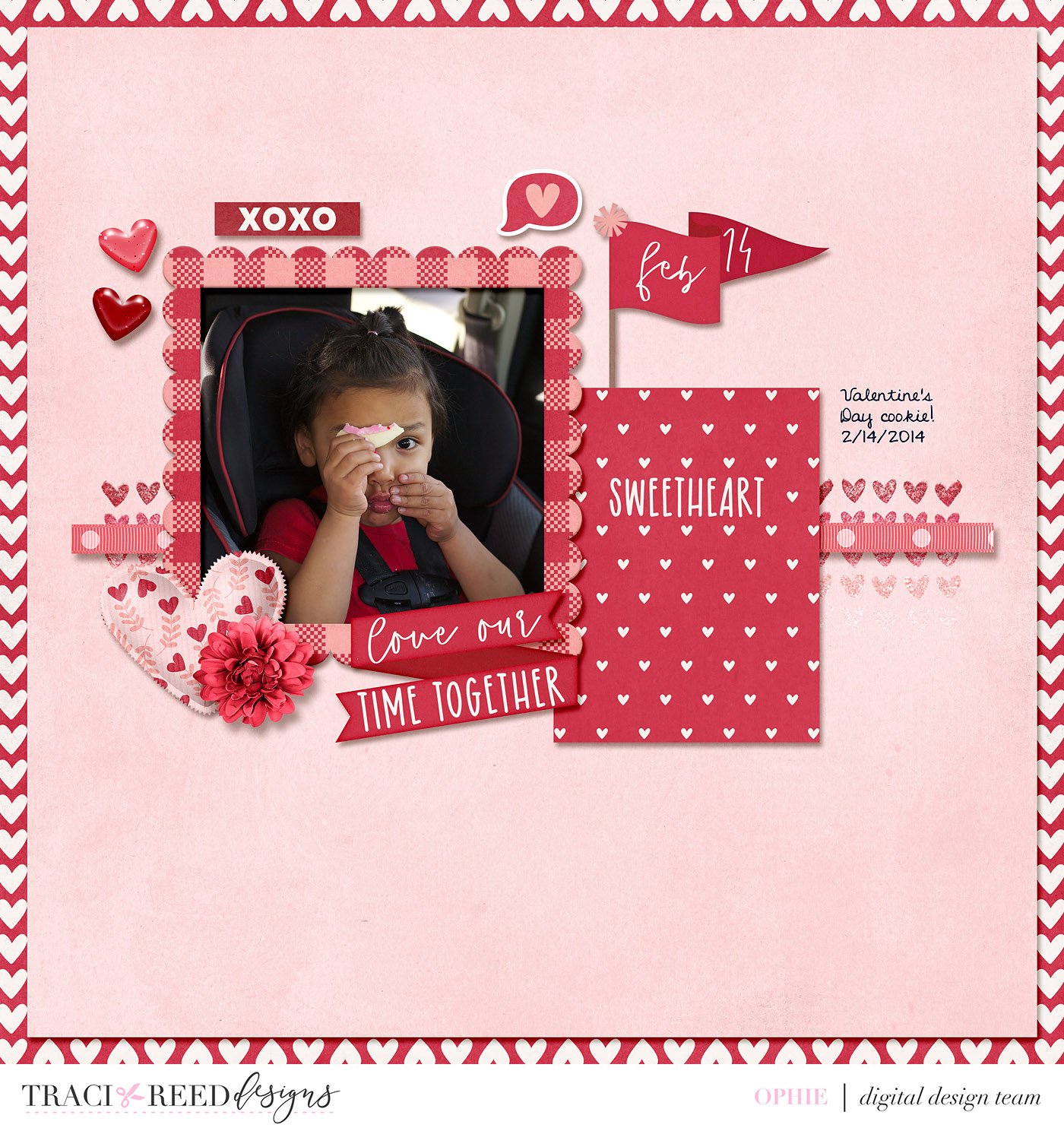 I chose to do my page with reds and pinks using Traci’s Smitten kit. The colors matched my photo perfectly. Since I was focusing on two colors, I created a simpler page than I would normally do. Here is my page below.