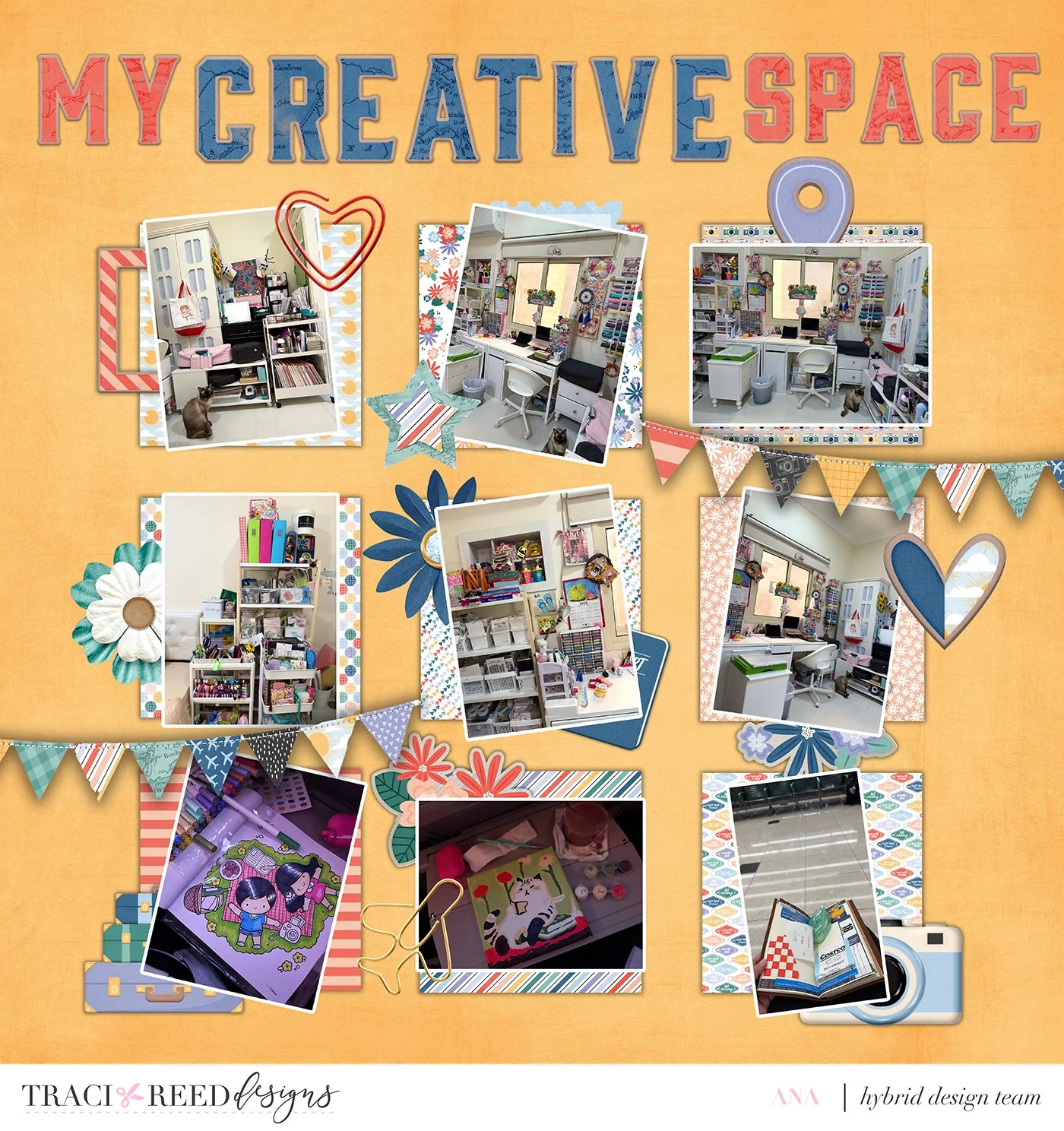 For this prompt, I created a digital scrapbook page titled “My Creative Space” using Traci Reed’s Wander and Wonder collection. It felt like the perfect fit because my creative life has literally been flying back and forth with me. From Manila to Saudi Arabia, I brought all my crafting stash and machines with me, actually bringing more of those than clothes. This layout features photos of my current craft room in Saudi, built from supplies I slowly bring over each time we go home, since crafting goodies are much easier (and cheaper!) to find in Manila.
