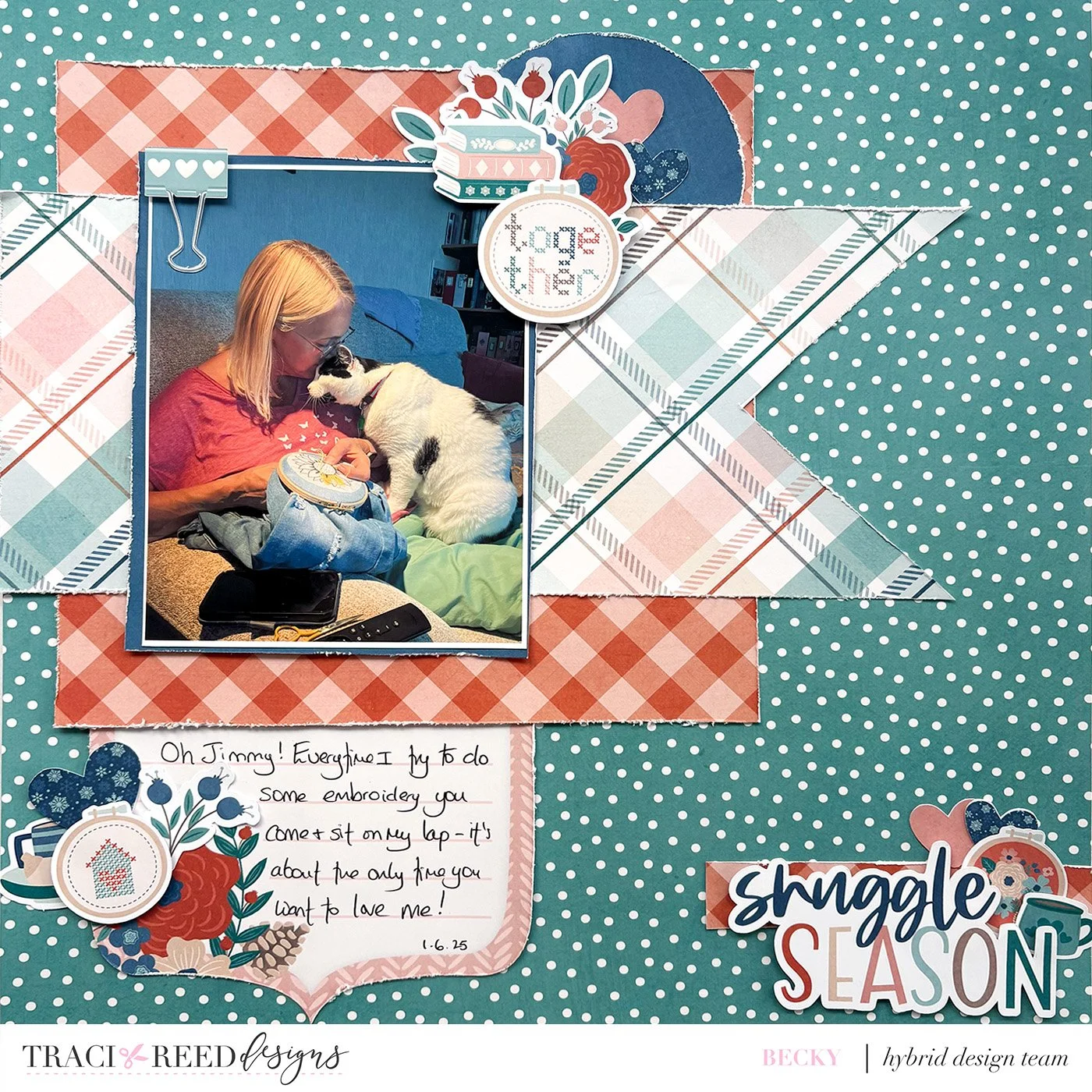 When I saw the prompt of Rest Day I knew I wanted to scrap this photo of me and my cat who comes to sit on my lap whenever I decided to have a day of relaxing and doing embroidery! I used Hygge Season which could be seen as a winters collection but I’ve actually used it here to record a day in June, so I love how versatile it is!