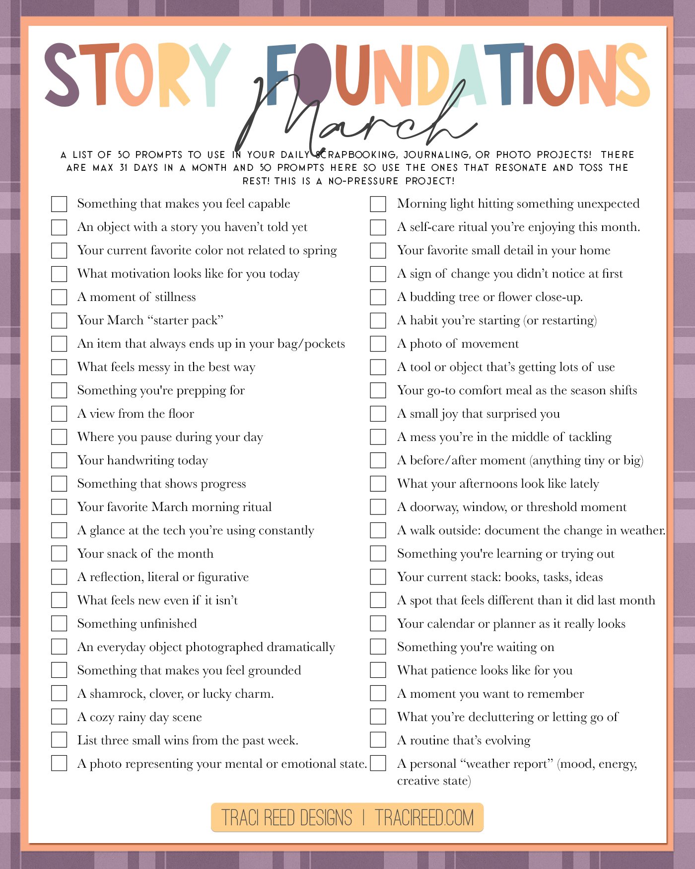 That’s why the March Story Foundations prompt list includes 50 story and photo prompts. There’s no expectation to use them all and no pressure to document every day. Think of this list as a flexible set of ideas you can dip into whenever you want a little direction or creative momentum.