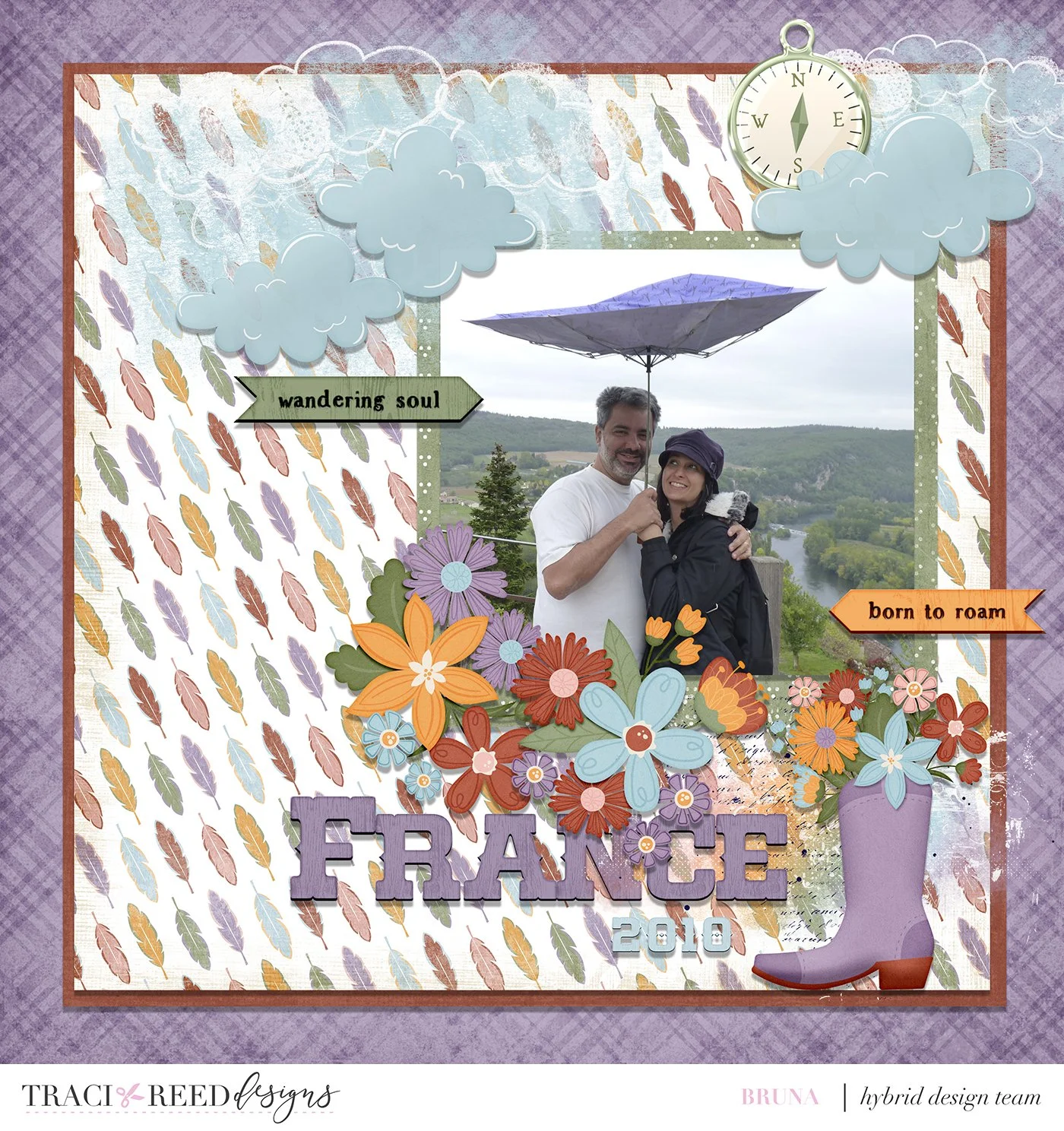 For this layout, I started with the photo, its colors, and the rainy day theme to choose the paper collection. Trailblazer was perfect because it had lilac and green, matching the photo, and the digital kit had beautiful clouds. Plus, wonderful flowers, which are a must in my layouts!