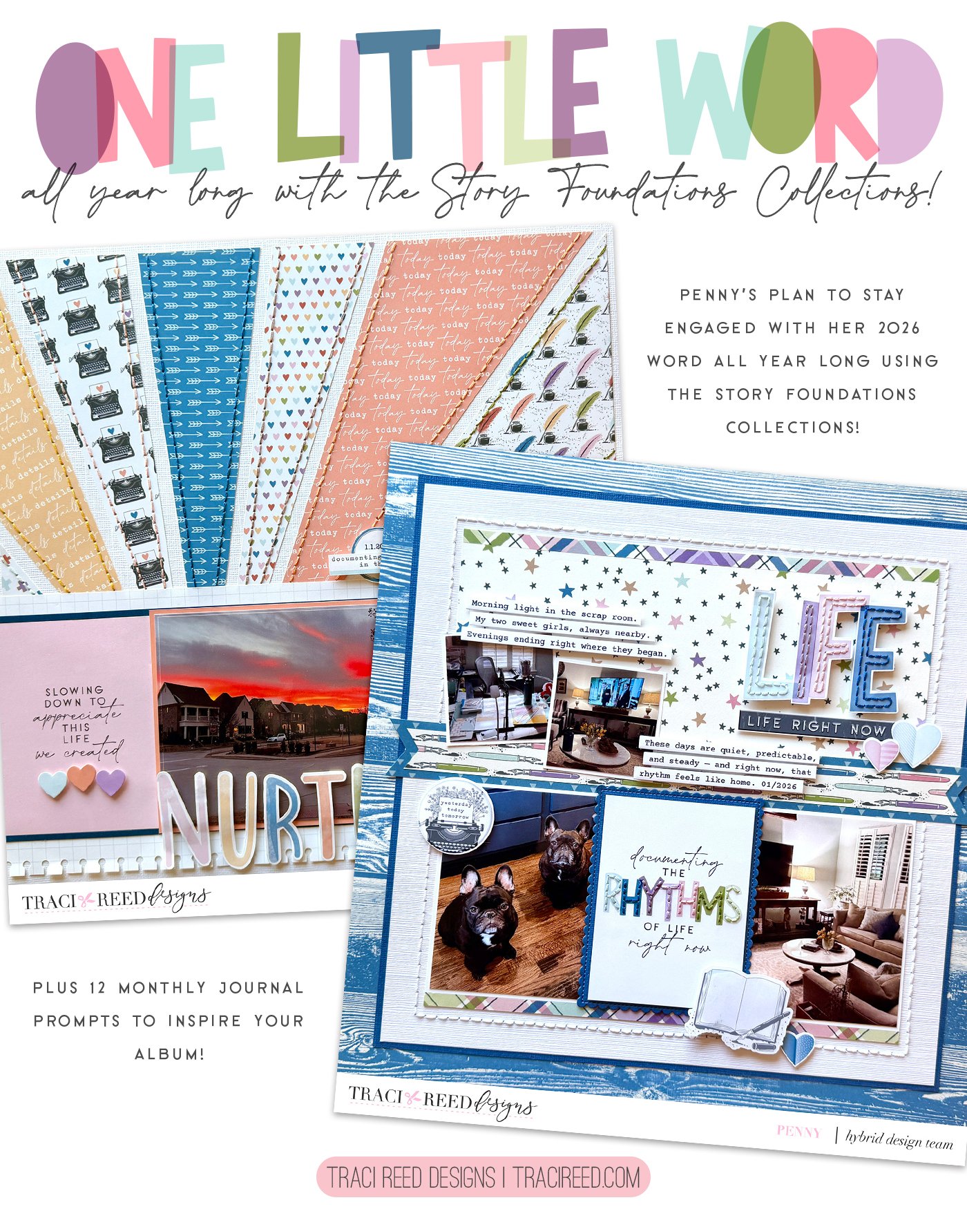 Hi friends, Penny here! I’m kicking off 2026 with my One Little Word® (OLW): NURTURE and the brand new Traci Reed Designs Story Foundations collection, and I’m thrilled to share how the two are working together on my pages.